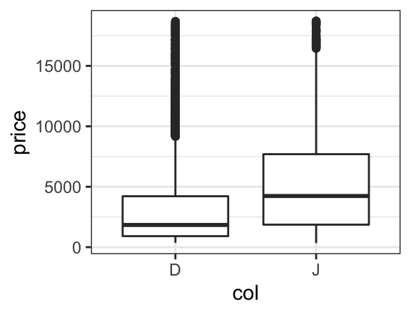 bwplot(price ~ col, data = diamonds2) t.test(price ~ col, data = diamonds2) lm(price ~ col, data = diamonds2)