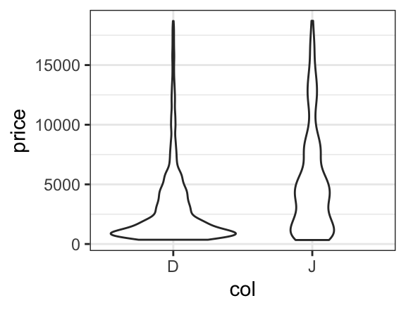 gf_boxplot(price ~ col, data = diamonds2) gf_violin(price ~ col, data = diamonds2)
