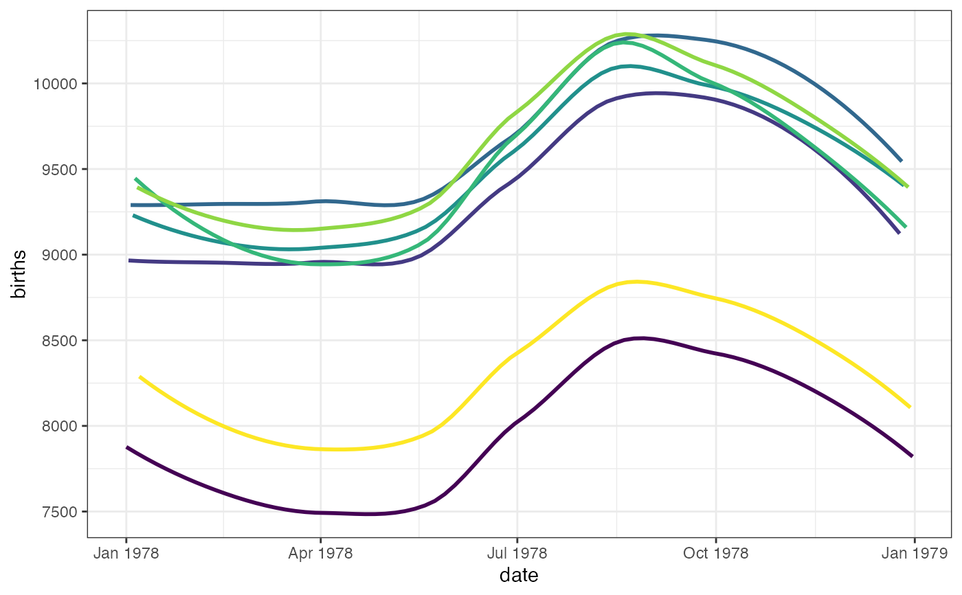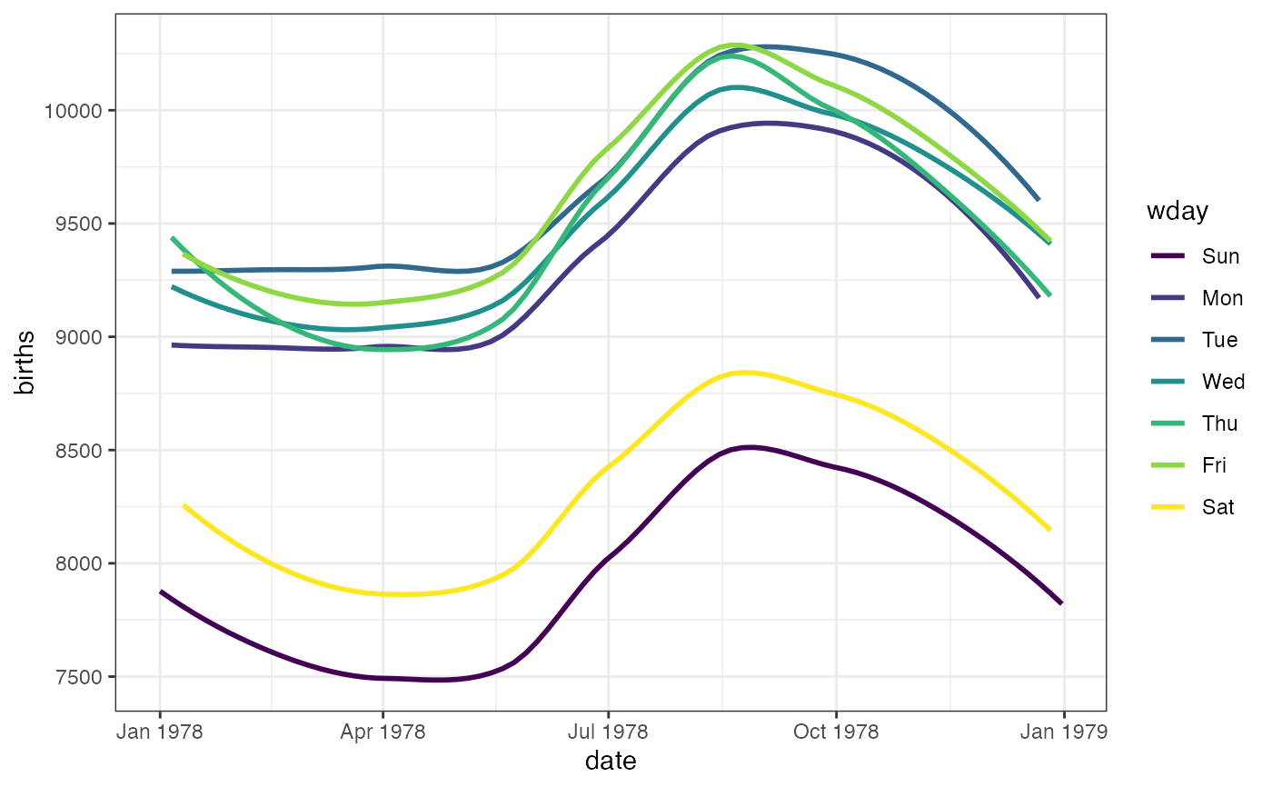 gf_smooth(births ~ date, color = ~wday, data = mosaicData::Births78)