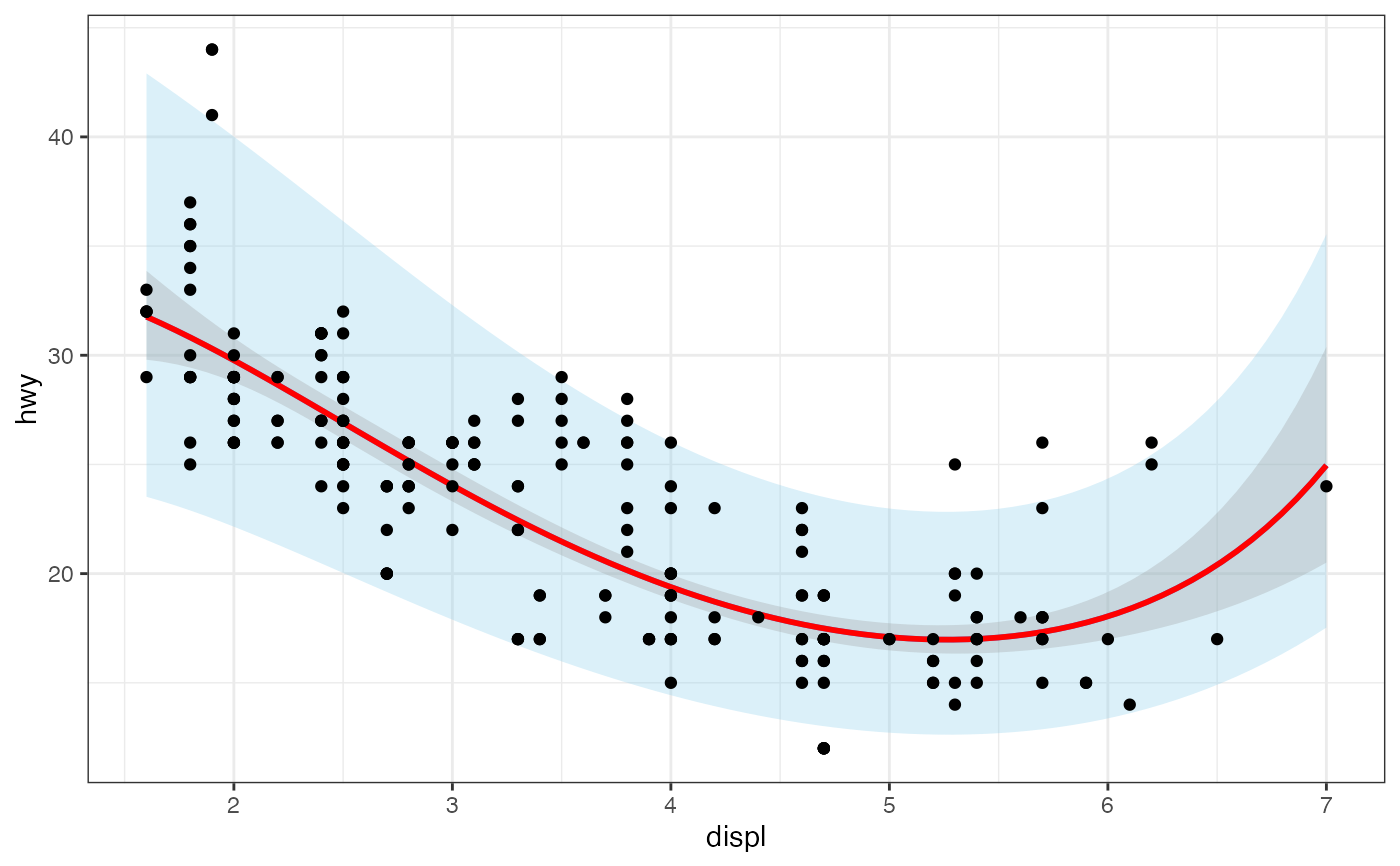 method = NULLthe smoothing method is chosen based on the size of the largest group (across all panels).stats::loess()is used for less than 1,000 observations; otherwisemgcv::gam()is used withformula = y ~ s(x, bs = "cs")withmethod = "REML". Somewhat anecdotally,loessgives a better appearance, but is \(O(N^{2})\) in memory, so does not work for larger datasets.If you have fewer than 1,000 observations but want to use the same