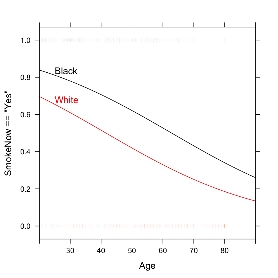 mod <- glm( SmokeNow =="Yes" ~ Age + Race3, data=NHANES, family=binomial()) SmokerProb <- makeFun(mod) xyplot( SmokeNow=="Yes" ~ Age, groups=Race3, data=NHANES, alpha=.01, xlim=c(20,90) ) plotFun(SmokerProb(Age, Race3="Black") ~ Age, col="black", add=TRUE) plotFun(SmokerProb(Age, Race3="White") ~ Age, col="red", add=TRUE) ladd(grid.text("Black", x=25, y=SmokerProb(25, Race="Black"),hjust = 0, vjust=-0.2, gp=gpar(col="black"), default.units="native")) ladd(grid.text("White", x=25, y=SmokerProb(25, Race="White"),hjust = 0, vjust=-0.2, gp=gpar(col="red"), default.units="native"))