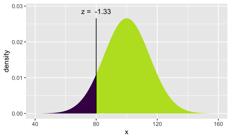 ## P(X <= 80) = P(Z <= -1.333) = 0.09121