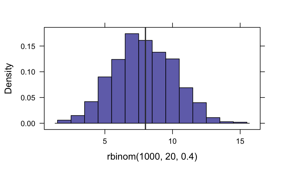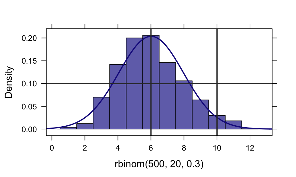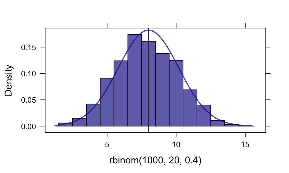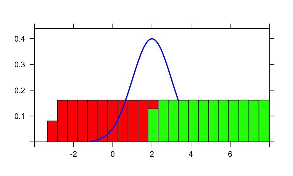 plotDist("norm", col="blue", mean=2, xlim=c(-4,8)) plotDist("norm", mean=5, col="green", kind='histogram', add=TRUE) # add, overtop plotDist("norm", mean=0, col="red", kind='histogram', under=TRUE) # add, but underneath!