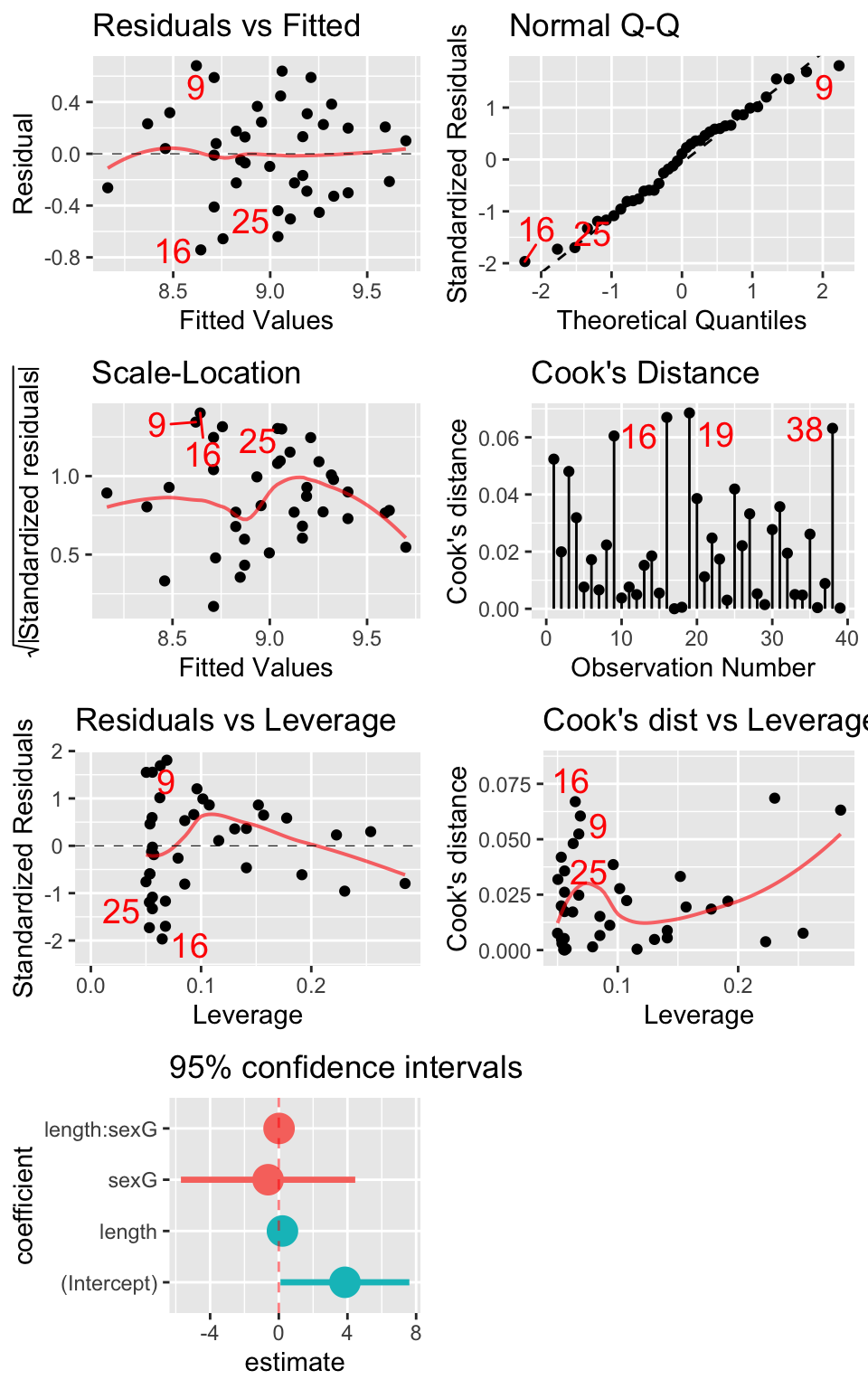require(gridExtra) mod <- lm(width ~ length * sex, data = KidsFeet) mplot(mod, which = 1:7, multiplot = TRUE, ncol = 2)