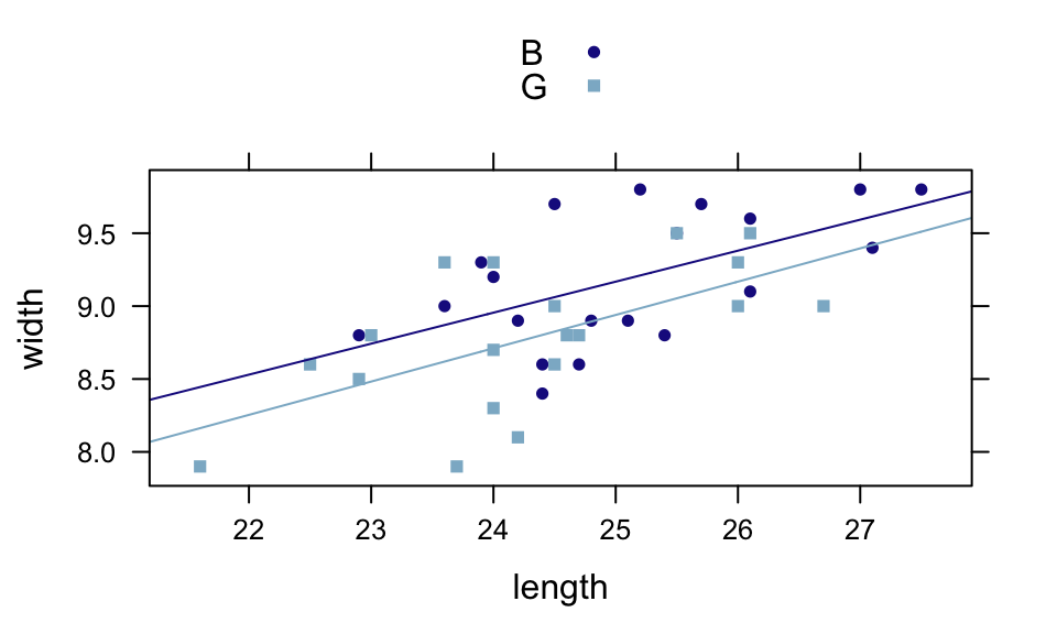 xyplot(width ~ length, groups = sex, data = KidsFeet, auto.key=TRUE) plotFun( L(length, sex="B") ~ length, add=TRUE, col=1 )