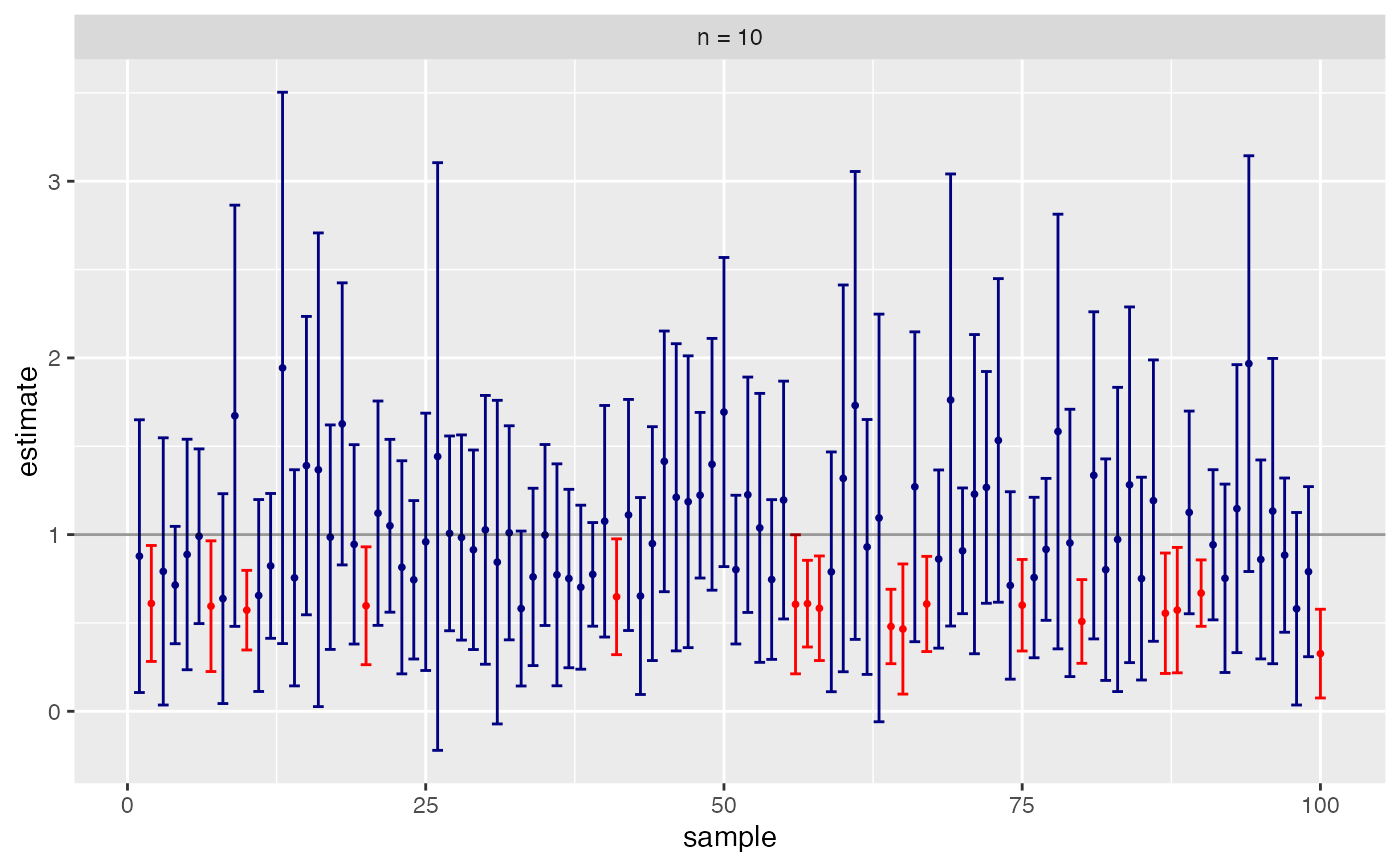 CIsim(n = 10, samples = 100, rdist = rexp, estimand = 1)