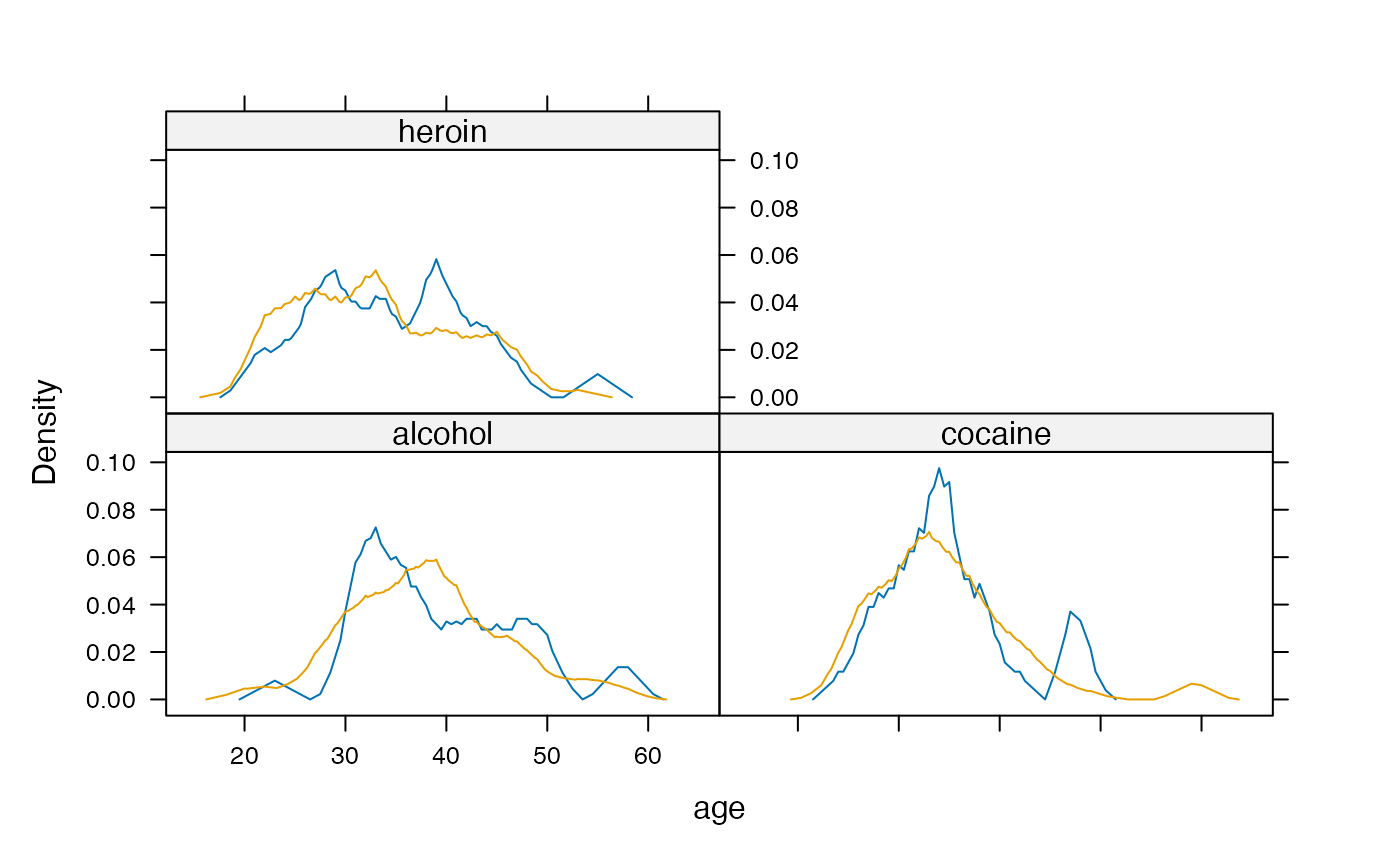 ashplot( ~age | substance, groups = sex, data = HELPrct)