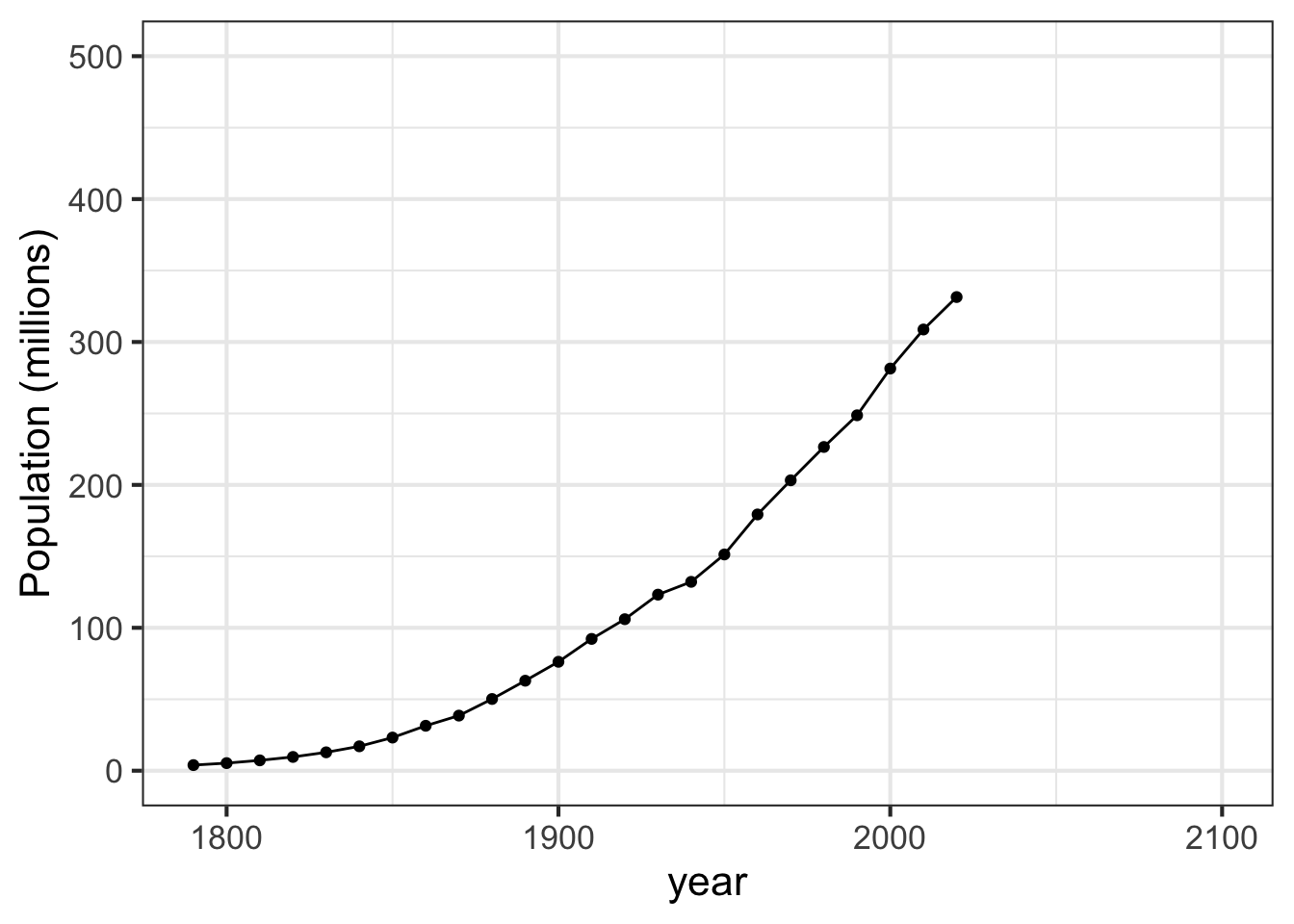 Every 10 years, starting in 1790, the US Census Bureau carries out a constitutionally mandated census: a count of the current population. The overall count as a function of year is shown in Figure fig-pop-graph. [Source]
