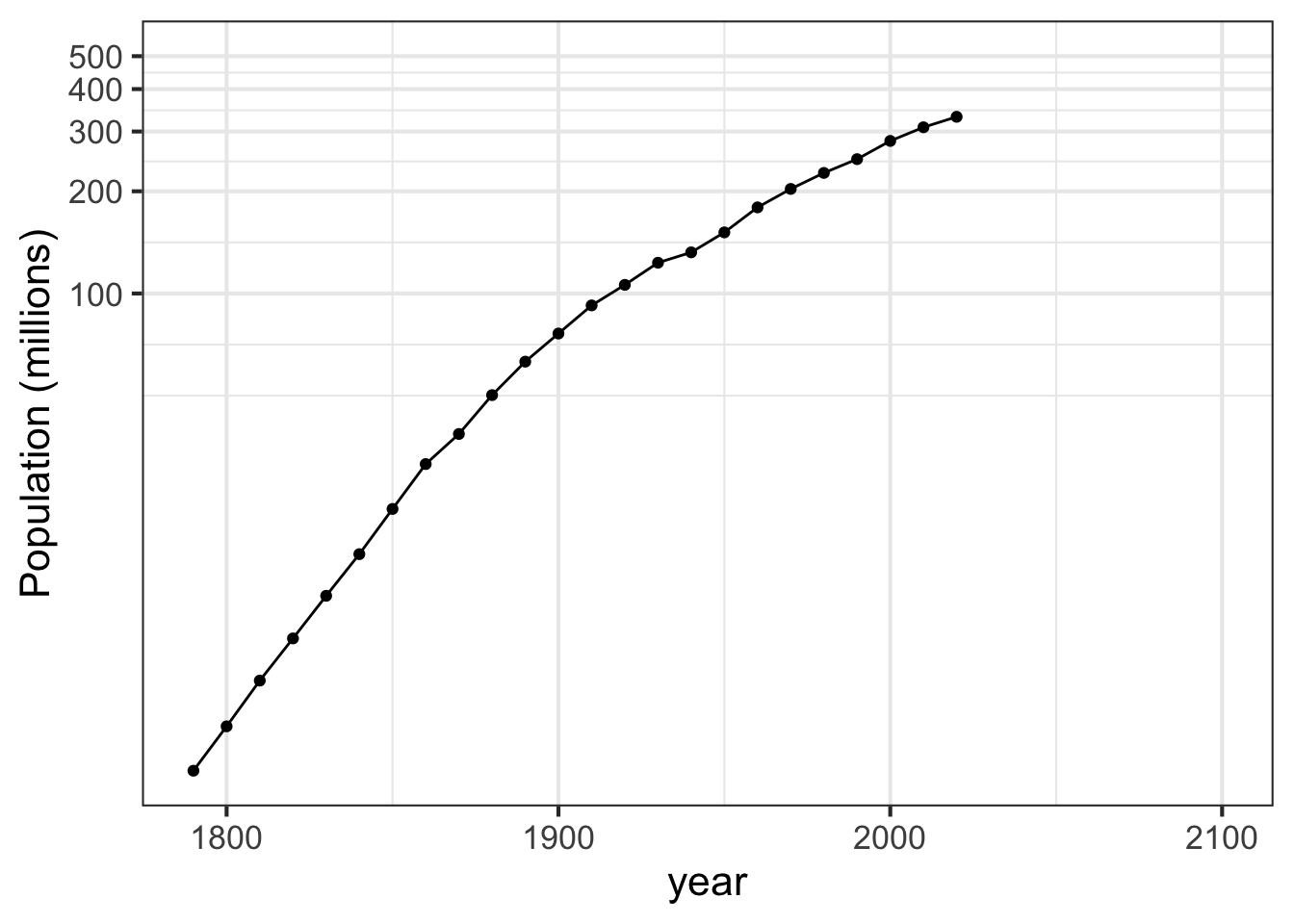 It is tempting to look for simple patterns in such data. Perhaps the US population has been growing exponentially. A semi-log plot of the same data suggests that the growth is only very roughly exponential. A truly exponential process would present as a curve with a constant derivative, but the derivative of the function in the graph is decreasing over the centuries.