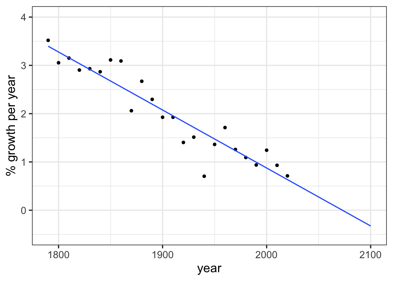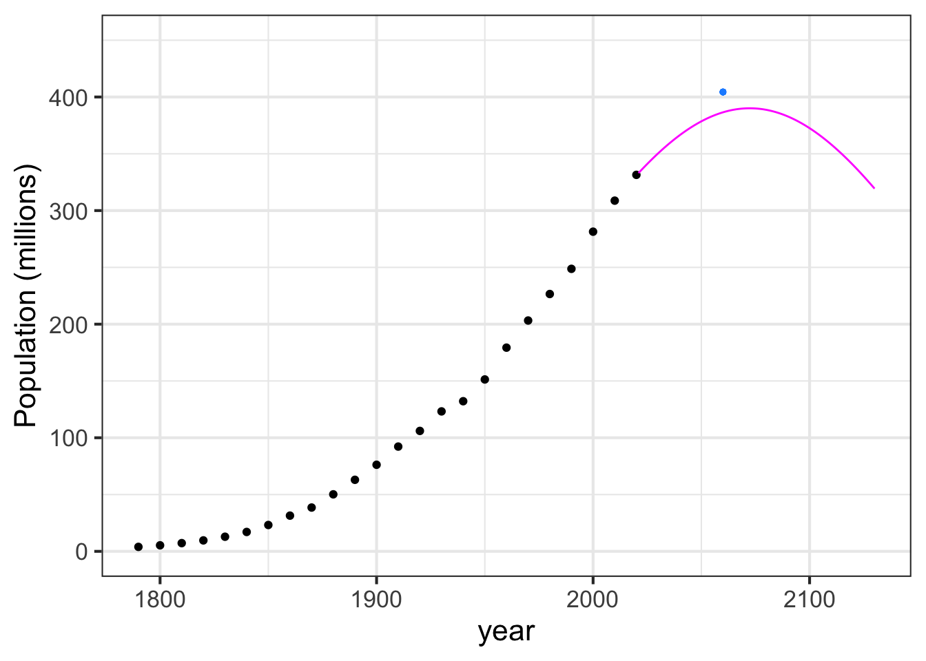 If the trend in the growth rate continues, the US will reach zero net growth about 2070, then continue with negative growth. Of course, negative growth is just decline. A simple prediction from Figure fig-pop-growth is that the argmax of the US population—that is, the year that the growth rate reaches zero—will occur around 2070.