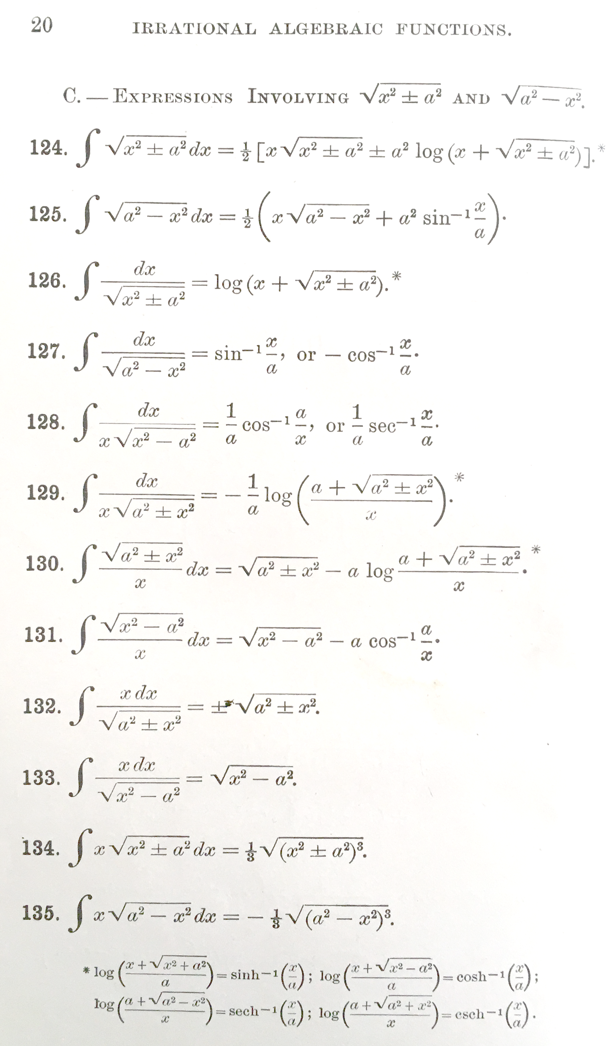 Simply to illustrate what a function catalog looks like, Figure fig-table-of-integrals shows a page from an 1899 handbook entitled A Short Table of Integrals.