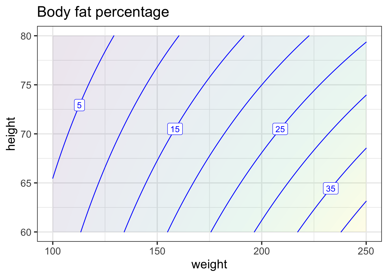 The polynomial we choose will omit the quadratic terms. It will contain the constant, linear, and interaction terms only. That is \[\text{body.fat}(h, w) \equiv c_0 + c_h h + c_w w + c_{hw} h w\] The process of finding the best coefficients in the polynomial is called linear regression. Without going into the details, we will use linear regression to build the body-fat model and then display the model function as a contour plot.