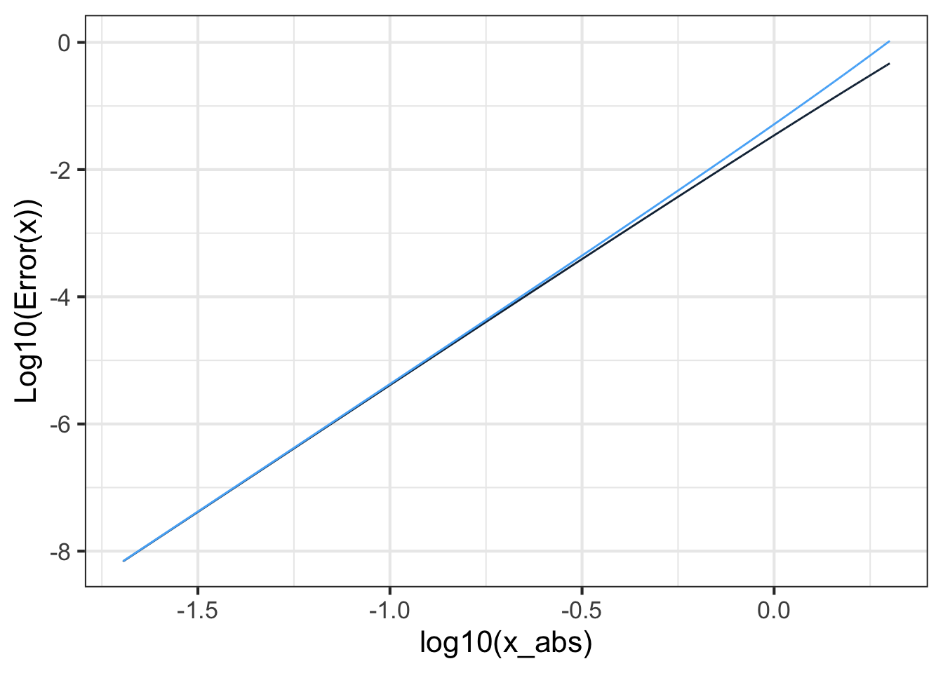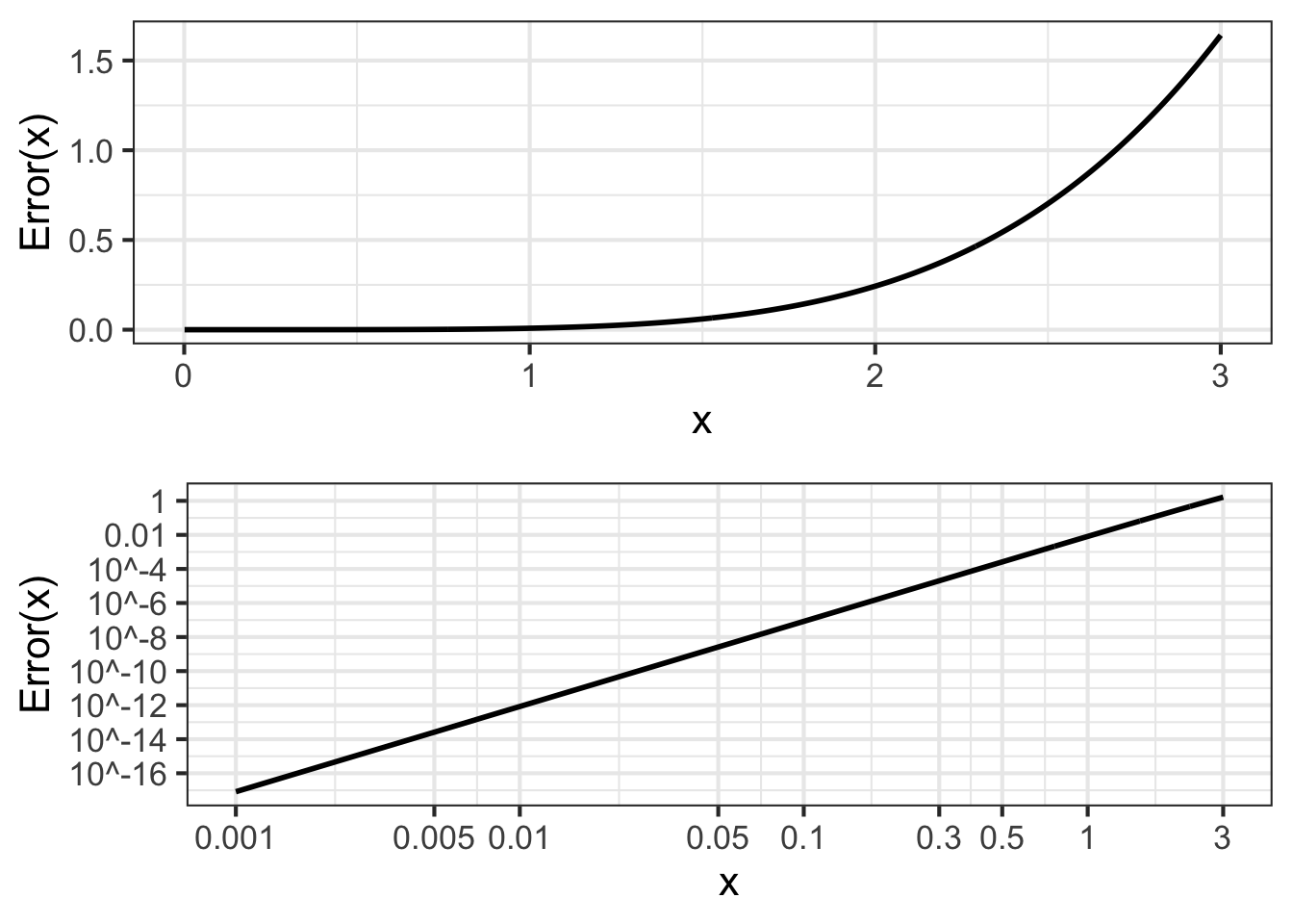 The plot of \(\log_{10} {\cal E}(x)\) versus \(\log_{10} | x |\) in Figure fig-taylor-exp-5 shows that the error grows from zero at \(x=0\) as a power-law function. Measuring the exponent of the power-law from the slope of the graph on log-log axes give \({\cal E}(x) = a |x-x_0|^5\). This is typical of Taylor polynomials: for a polynomial of degree \(n\), the error will grow as a power-law with exponent \(n+1\). This means that the higher is \(n\), the faster \(\lim_{x\rightarrow x_0}{\cal E}(x) \rightarrow 0\). On the other hand, since \({\cal E}_x\) is a power law function, as \(x\) gets further from \(x_0\) the error grows as \(\left(x-x_0\right)^{n+1}\).