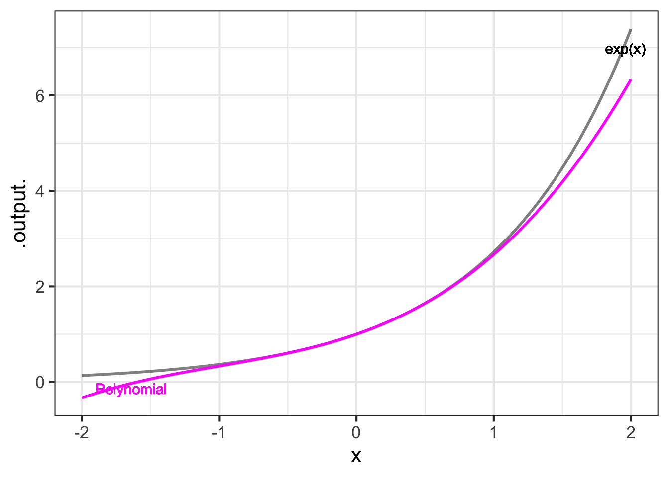 \[\partial_{xxx}g_{\exp}(x=0) = 2\cdot3\cdot a_3 = 6\, a_3\] Matching these to the exponential evaluated at \(x=0\), we get \[a_0 = 1\] \[a_1 = 1\] \[a_2 = \frac{1}{2}\] \[a_3 = \frac{1}{2 \cdot 3} = \frac{1}{6}\]