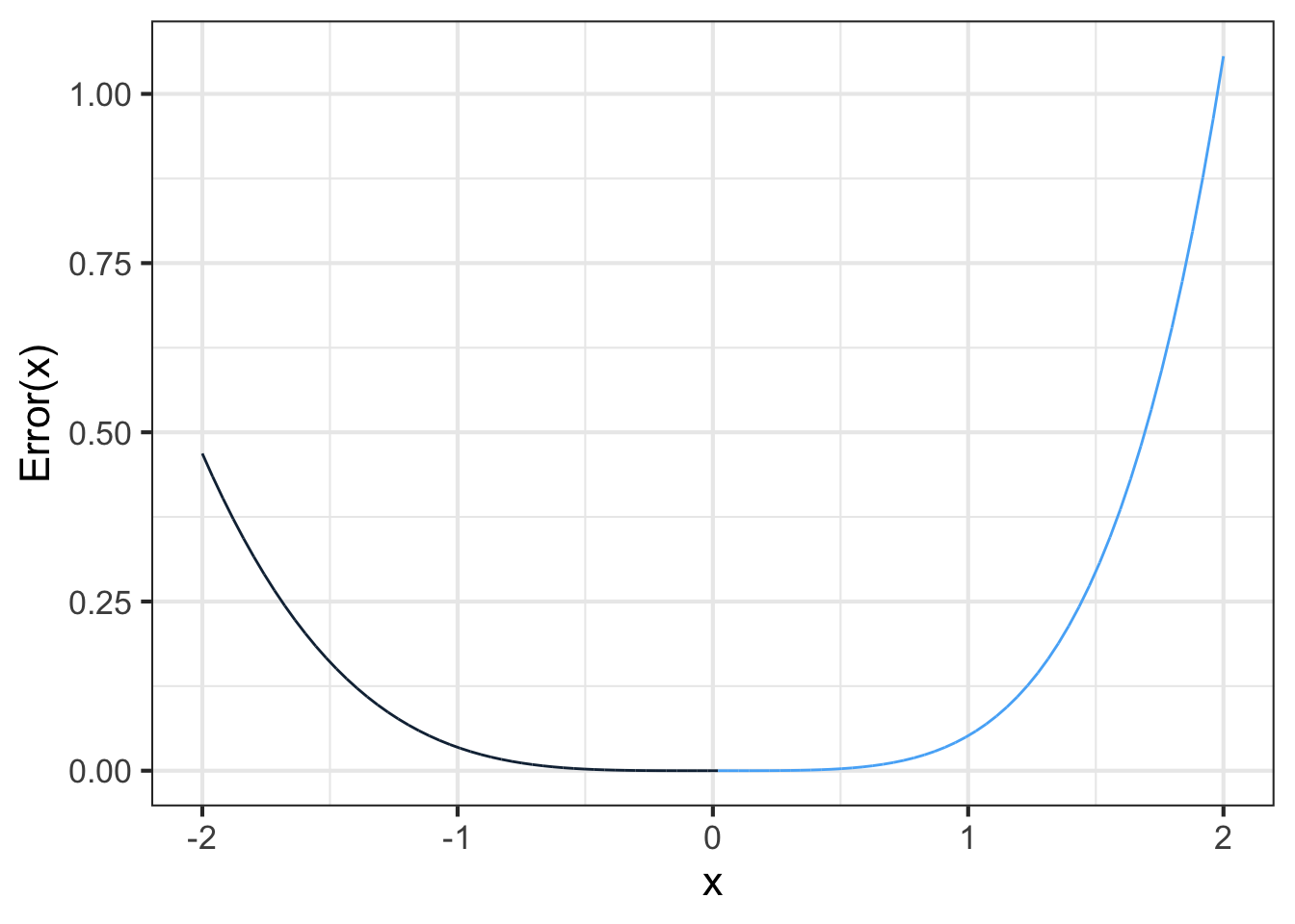 The polynomial is exact at \(x=0\). The error \({\cal E}(x)\) grows with increasing distance from \(x=0\):
