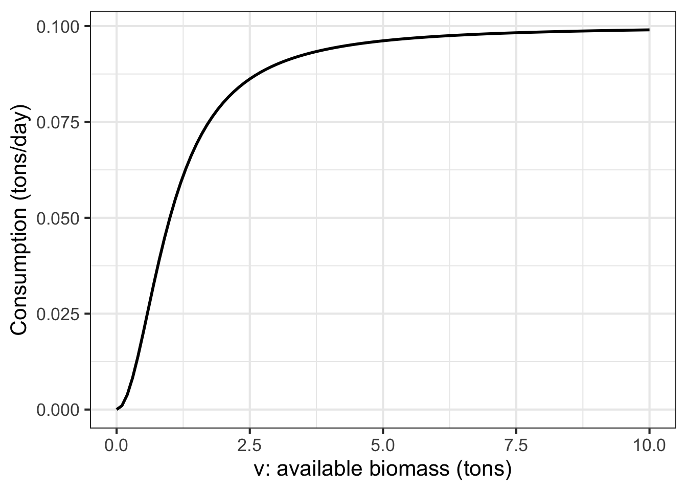 As a model for the production of biomass, denoted \(v\) for “vegetation,” we will use \[\partial_t v = r v \left(1 - \frac{v}{K}\right)\] which, as we’ve seen, has an unstable fixed point at \(v_1^\star=0\) and a stable fixed point at \(v_2^\star=K\). Physically, the fixed point \(v_1^\star\) corresponds to a bare field, without any vegetation. It is unstable because any small disturbance in the form of a stray seed landing in the dirt can lead to germination and the rapid growth of vegetation as seeds from the germinated plant spread across the field. Once the field is covered in vegetation, the growth can be exponentially rapid at first but then runs into limited resources: there is only so much sunlight that falls on the field, and the growing vegetation will eventually consume the soil nutrients and water.