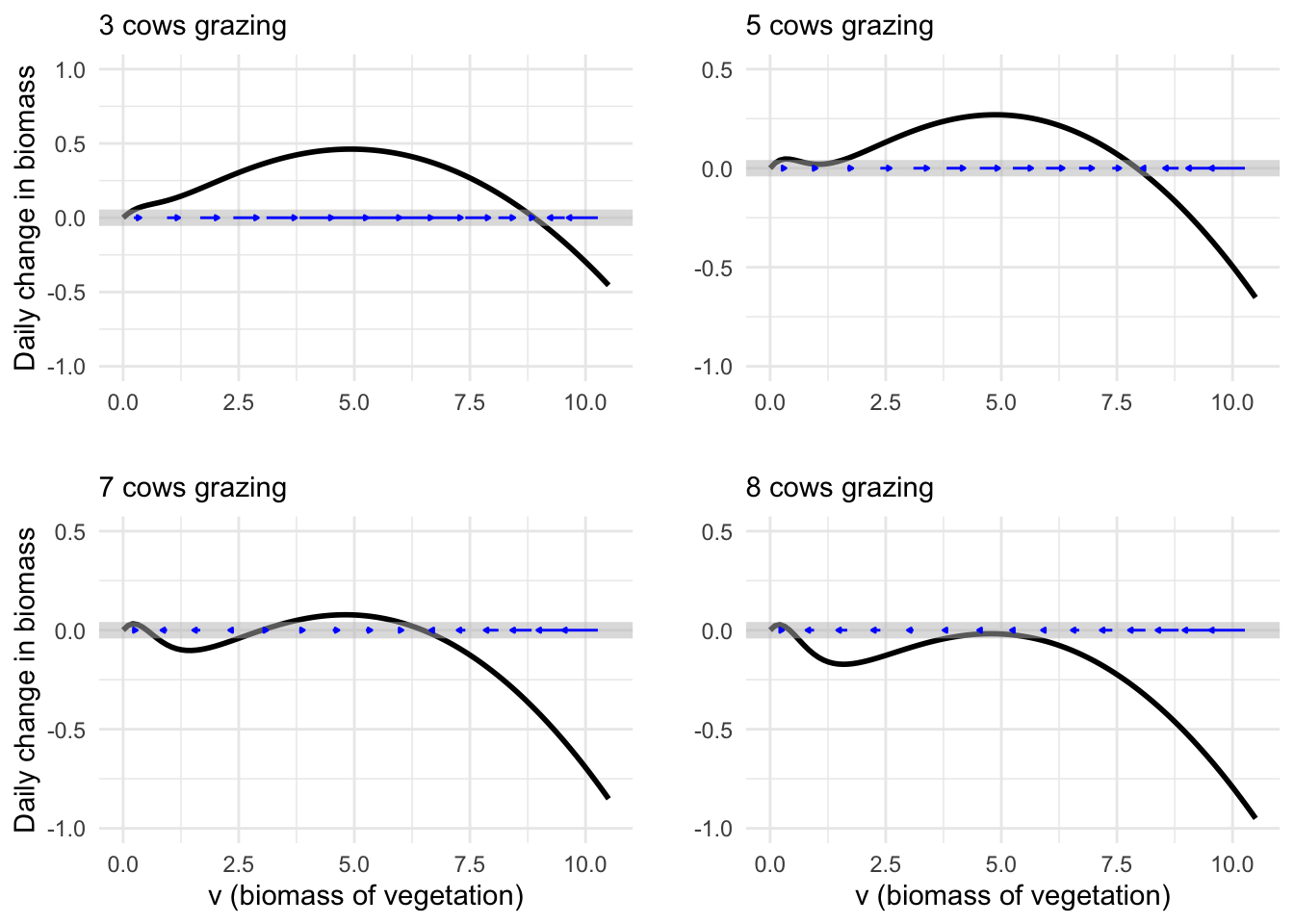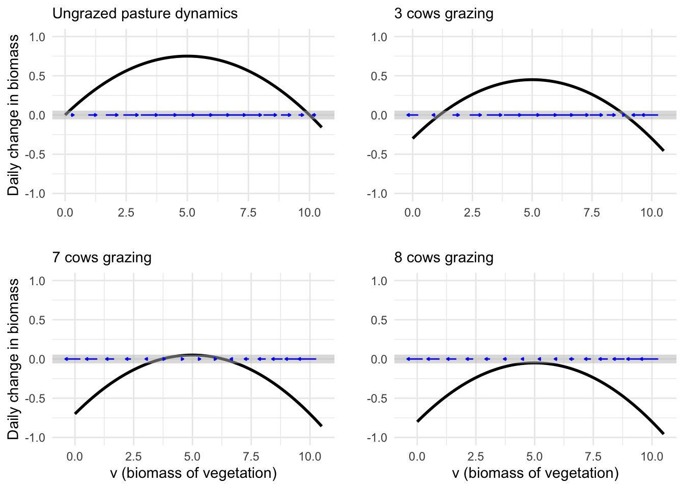 With grazing, the net growth of biomass is reduced due to the removal of the consumed biomass by the cows’ consumption. For a moderate herd size, there is still a stable fixed point, but it is at a lower level of biomass than would be seen in the ungrazed field. But if the herd size is too large, the ecosystem completely collapses.