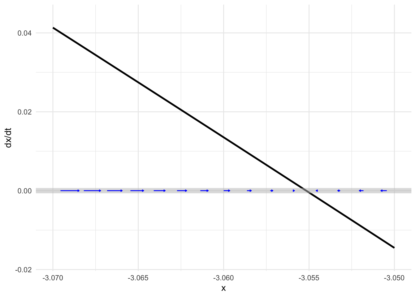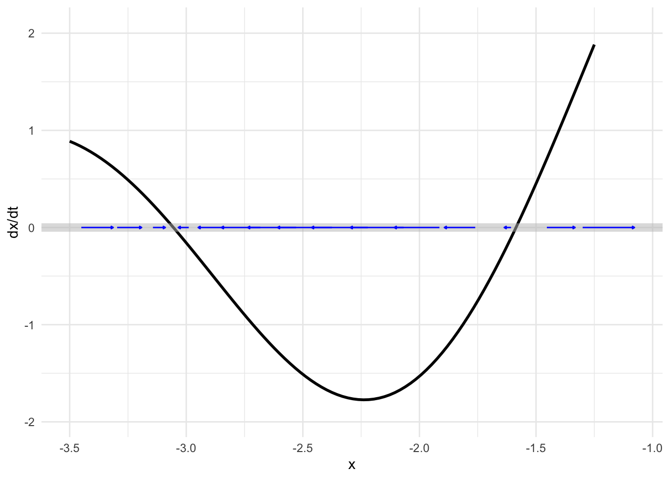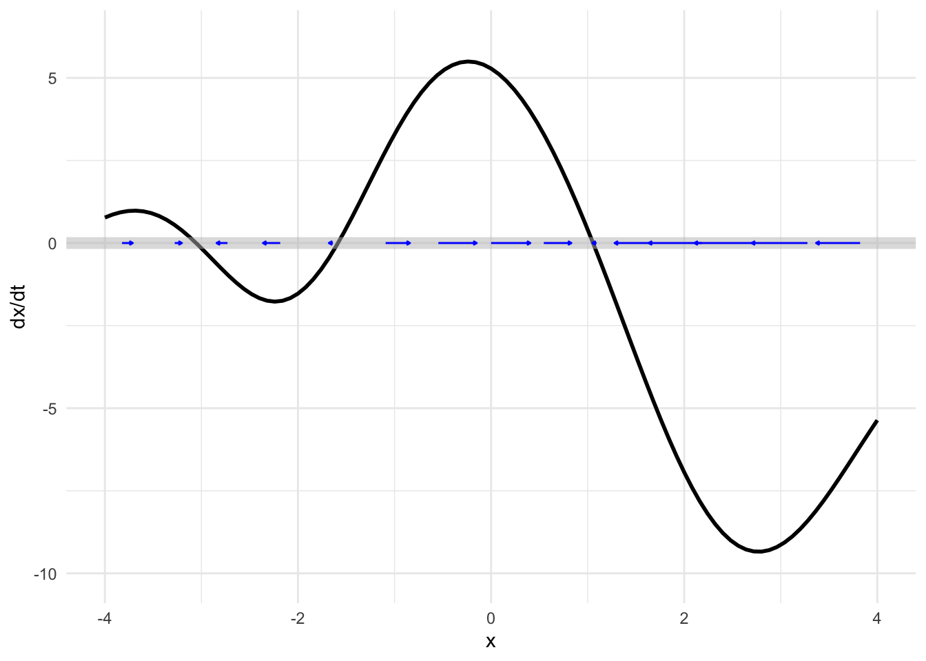 Happily, with a one-dimensional state space, we can easily show both the flow vectors and the single dynamical function at once.