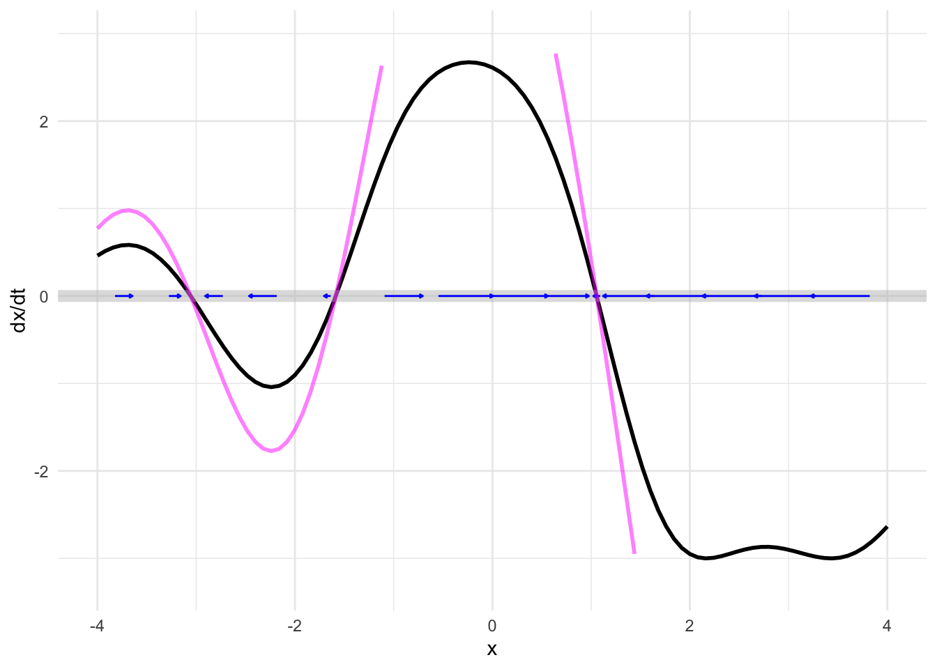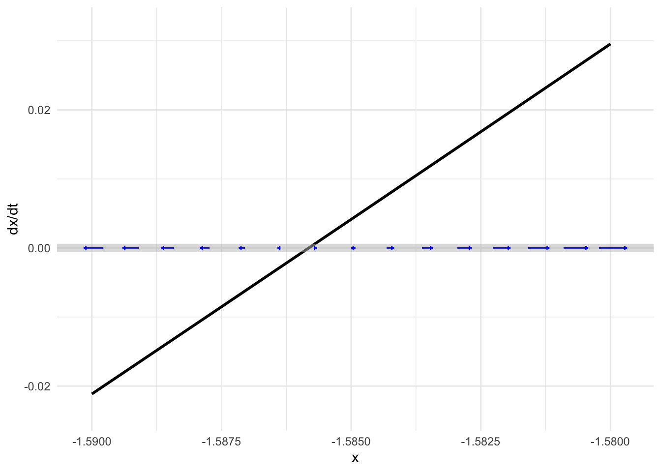 The short pieces of the dynamical function shown in Figure 45.4, are, like short pieces of any continuous function: almost exactly straight lines. For the left fixed point, the dynamical function is \(f(x) \approx -2.804 (x + 3.055)\) while for the right it is \(f(x) \approx 5.065 (x + 1.586)\). In Section @ref(symbolic-solutions-ODE) we found symbolically the solutions for dynamical functions in this form. For \(x_0\approx-3.055\) the solution is \[x(t) \approx (x_0 + 3.055)e^{-2.804 t} - 3.055\ ,\] while for \(x_0\approx -1.586\) the solution is \[x(t) \approx (x_0 +1.586)\, e^{5.065 t} - 1.586\ .\] There is something fundamentally different about these two solutions. One of them is exponential decay toward the fixed point, while the other grows exponentially away from the fixed point. We call the dynamics near the fixed-point with exponential decay stable and the dynamics near fixed-point with exponential growth unstable.