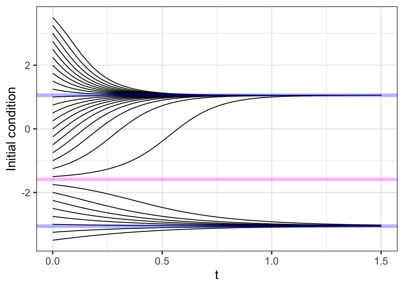 For example, Figure 45.6 shows a score of different time series following the solutions from a score of initial conditions. The long-term behaviors for all the time series is similar: they converge to one or another of the stable fixed points.