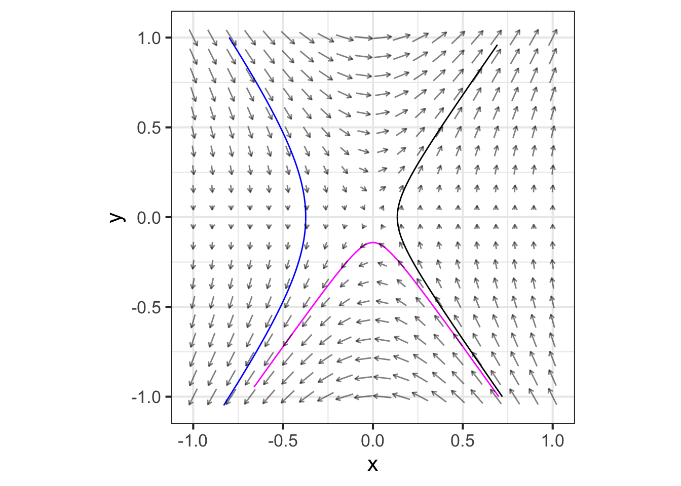\[\text{Simplification:}\ \ \ \ \ \begin{array}{l}\partial_t x = \cancel{ax} + b y\\\partial_t y =\ c x + \cancel{dy}\end{array}\ .\]