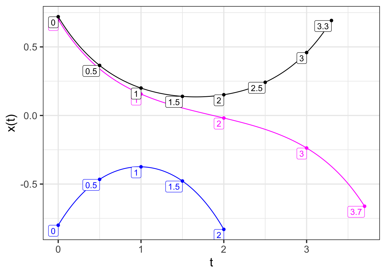 Exponentials are an important form of ansatz for linear differential equations. To show why, let’s review the solution to \(\partial_t x = k x\), but assume that all we know is that the solution is an exponential function of time: \(x(t) = A e^{\lambda t}\) and that we don’t yet know the parameters \(A\) or \(\lambda\). As usual for an ansatz, we plug it into both sides of the differential equation, giving \[\partial_t A e^{\lambda t} = k A e^{\lambda t}\ \ \implies \lambda A e^{\lambda t} = k A e^{\lambda t}\ \ \implies \lambda = k\ .\] Now we know the value of \(\lambda\).