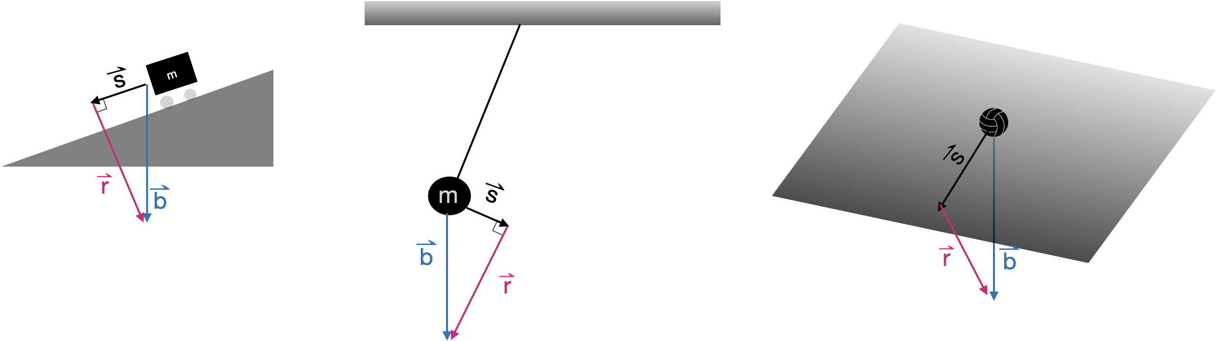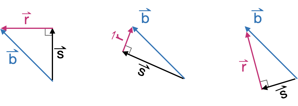 Many problems in physics and engineering involve the task of decomposing a vector \(\vec{b}\) into two perpendicular component vectors \(\hat{b}\) and \(\vec{r}\), such that \(\hat{b} + \vec{r} = \vec{b}\) and \(\hat{b} \cdot \vec{r} = 0\). There are infinite ways to accomplish such a decomposition, one for each way or orienting \(\hat{b}\) relative to \(\vec{b}\). Figure fig-decompose-1 shows a few examples.