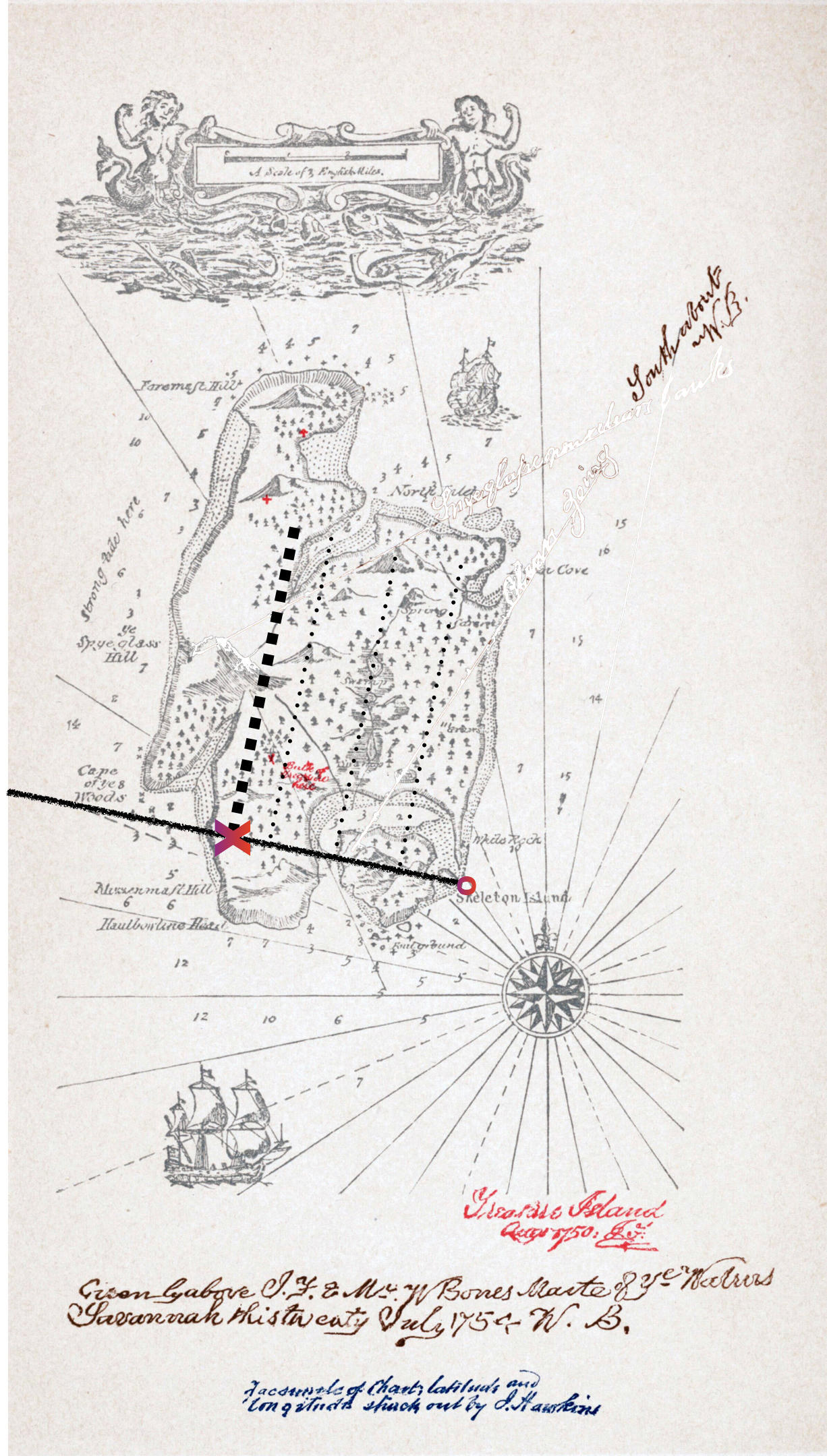 You may already have encountered the step (ii) technique in your childhood reading. The problem appears in Robert Louis Stevenson’s famous novel, Treasure Island. The story is about the discovery of a treasure map indicating the location of buried treasure on the eponymous Island. There is a red X on the map labelled “bulk of treasure here,” but that is hardly sufficient to guide the dig for treasure. After all, every buried treasure needs some secret to protect it. On the back of the map is written a cryptic clue to the precise location: