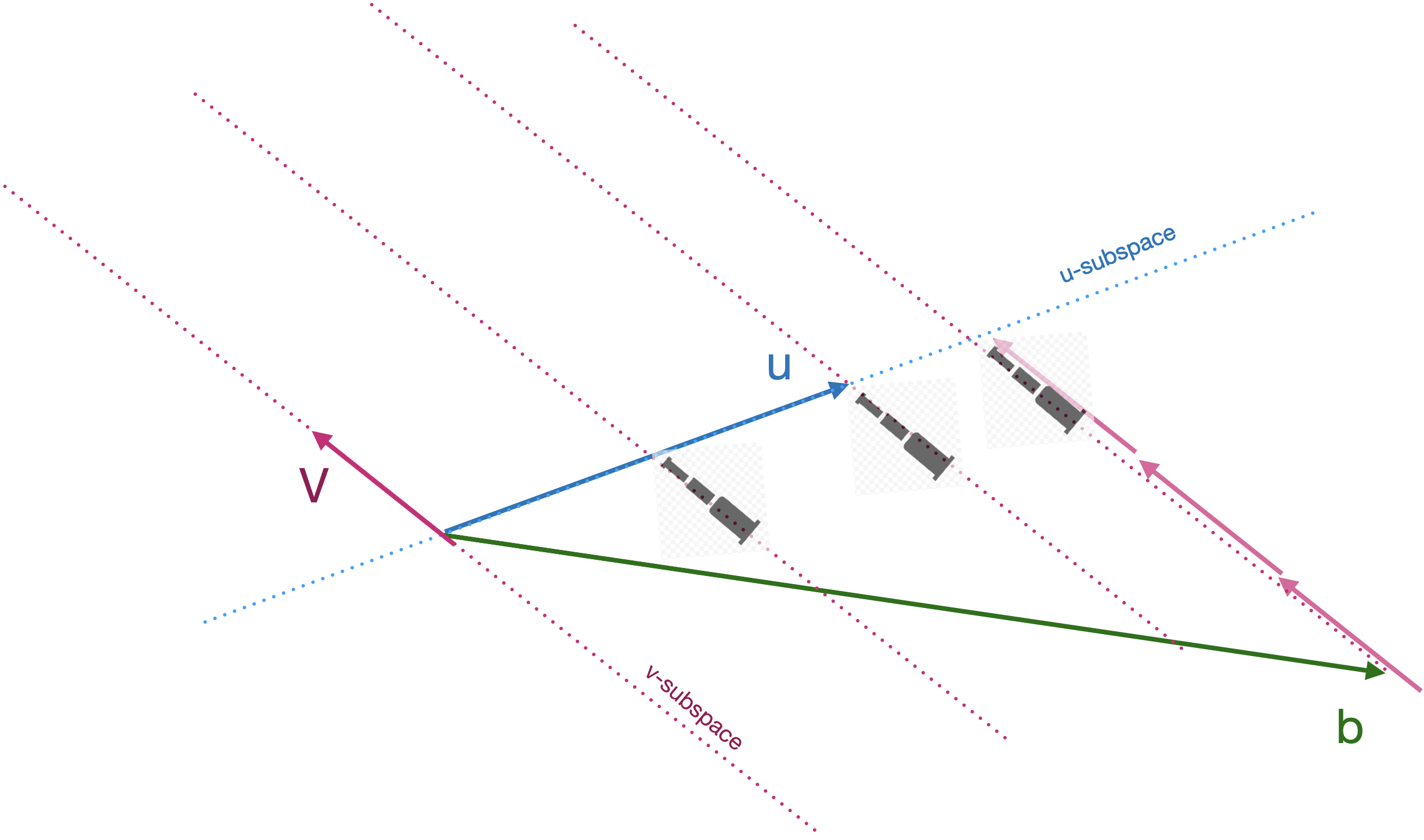 The algorithm is based in Long John Silver’s technique. Pick either \(\vec{u}\) or \(\vec{v}\), it does not matter which. In the diagram, we’ve picked \(\vec{v}\). Align your telescope with that vector. Now march along the other vector, \(\vec{u}\), carefully keeping the telescope on the bearing aligned with \(\vec{v}\). From the diagram, you can see that when you’ve marched to \(\frac{1}{2} \vec{u}\), the telescope does not yet have \(\vec{b}\) in view. Similarly, at \(1 \vec{u}\), the target \(\vec{b}\) isn’t yet visible. Marching a little further, to about \(1.6 \vec{u}\) brings you to the point in the \(\vec{u}\)-subspace where the target falls into view. This tells us that the coefficient on \(\vec{u}\) will be 1.6.