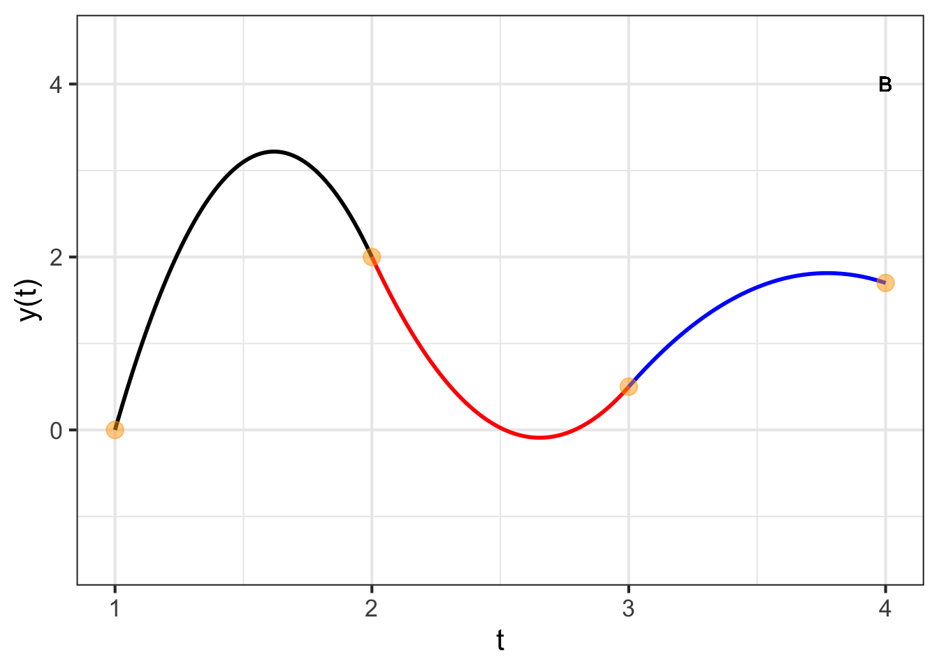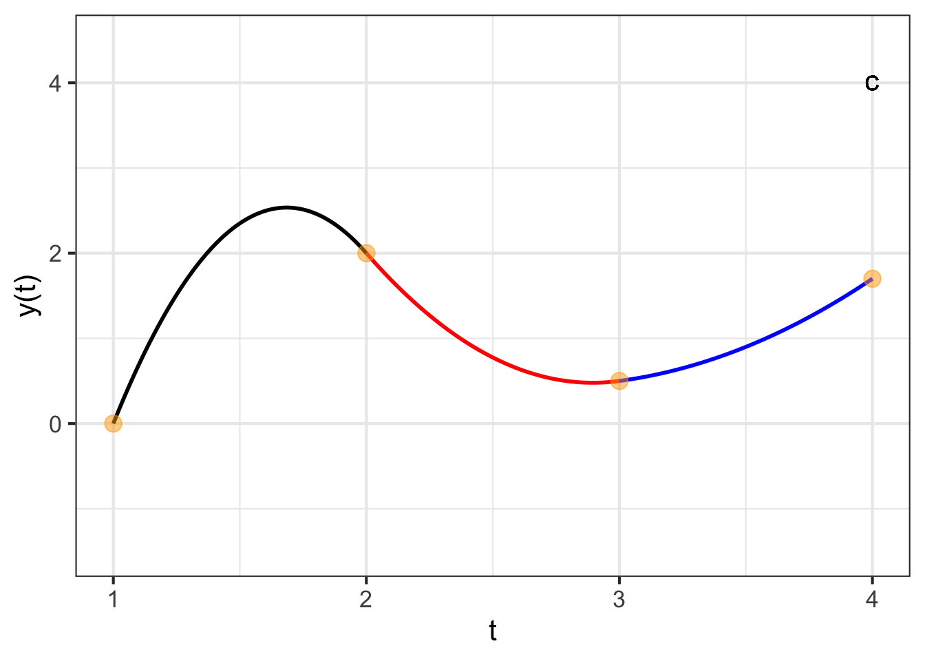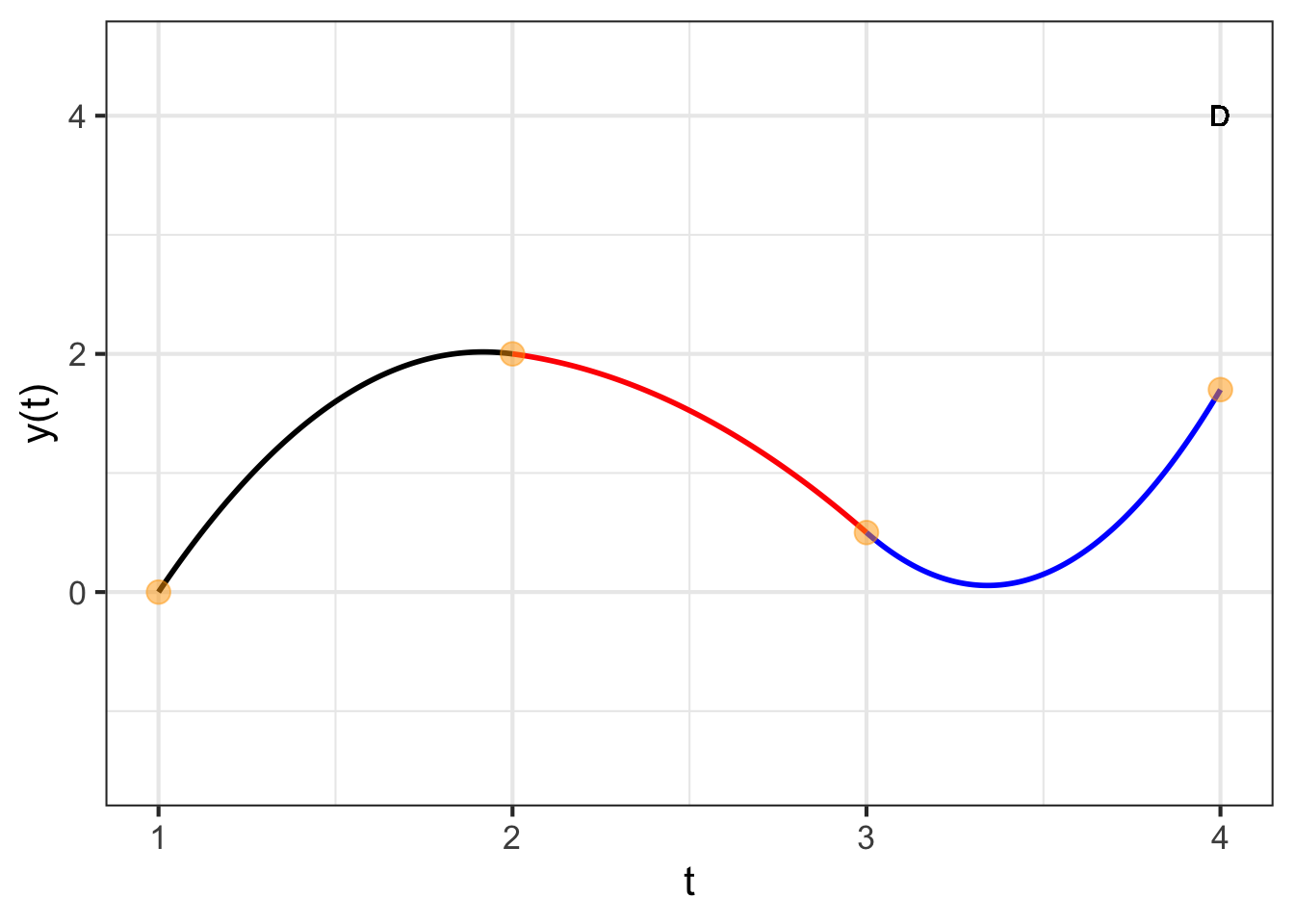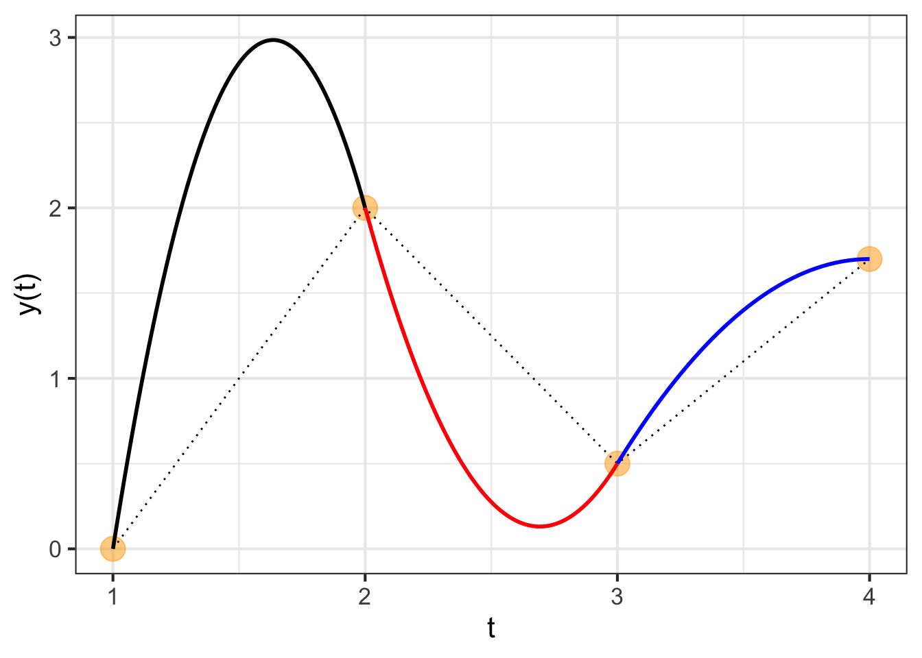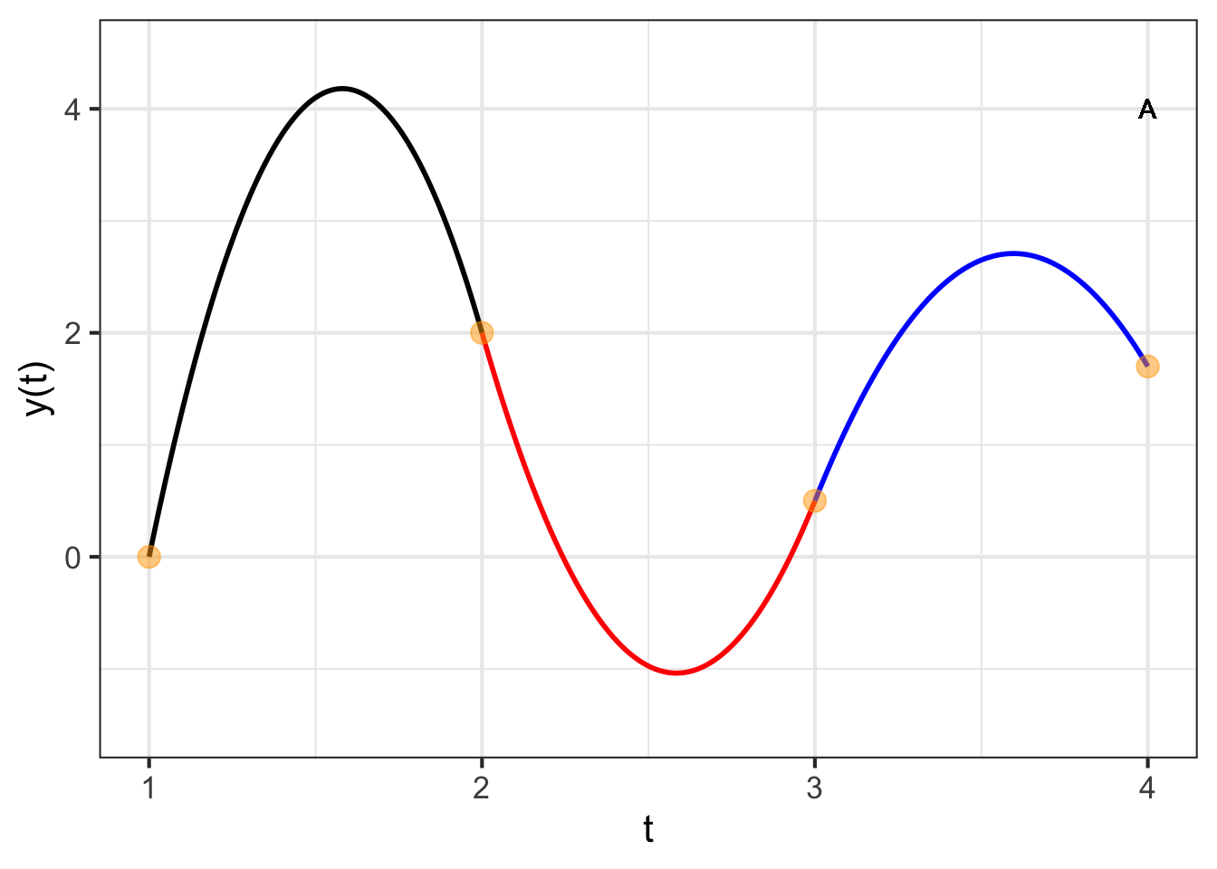 - It passes exactly through the two knots marking the segment’s endpoints. That is \(p_1(t_1) = y_1\) and \(p_1(t_2) = y_2 = p_2(t_2)\) and \(p_2(t_3) = y_3 = p_3(t_3)\) and, finally, \(p_3(t_4) = y_4\). Note that at the interior knots where two polynomials join, the left-hand polynomial and the right-hand polynomial should exactly match the function value and each other.