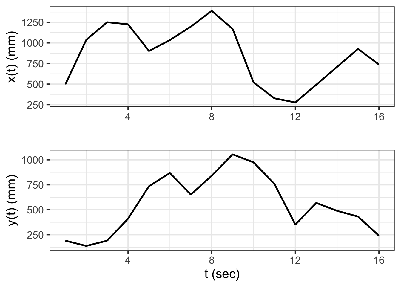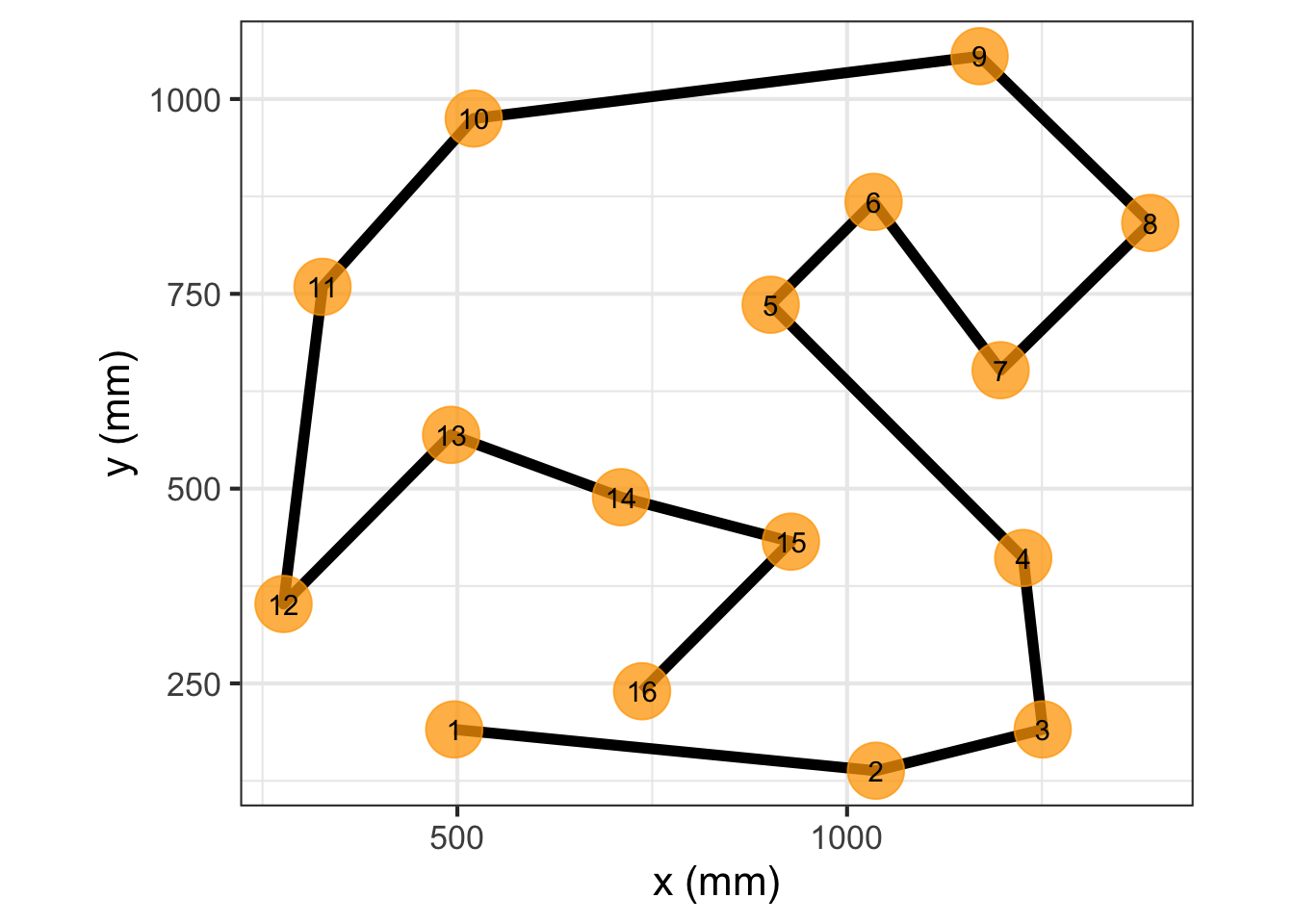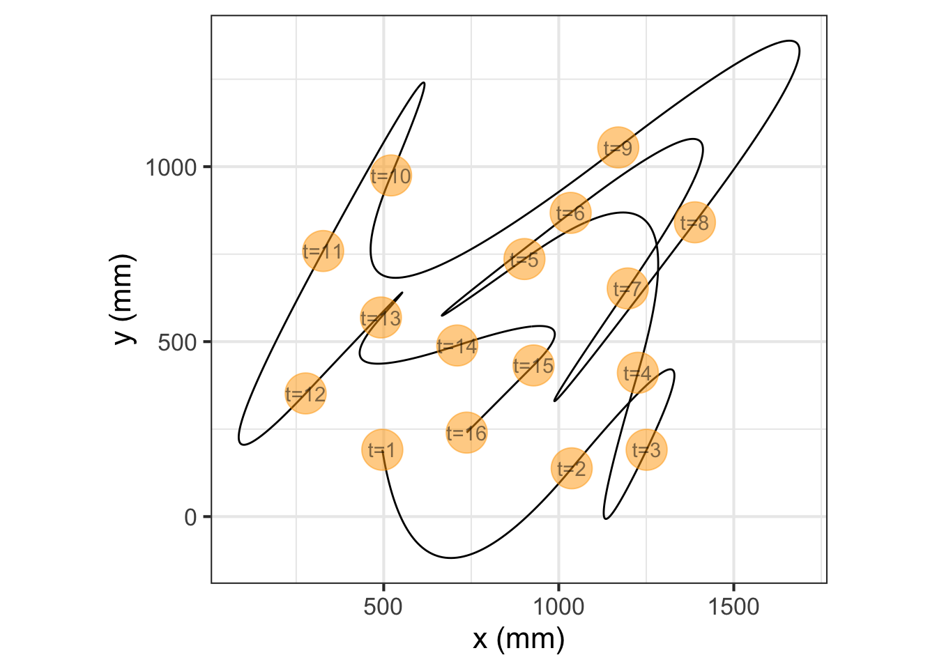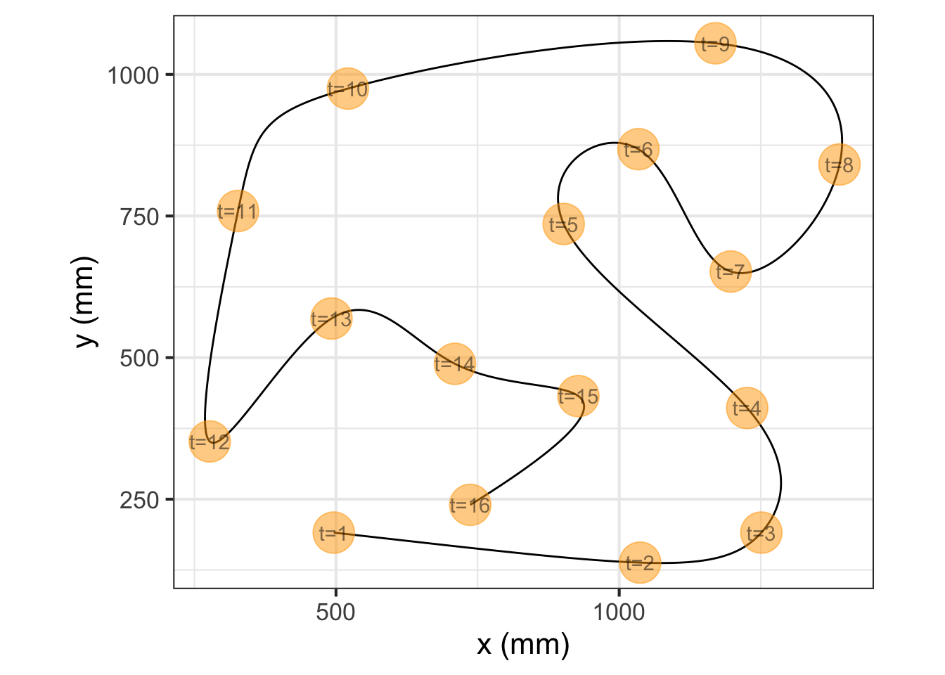 Figure fig-robot-points shows a continuous path in \((x,y)\) coordinates together with discrete labels indicating when each waypoint is to be reached. Note that the path is not a function \(y(x)\). Mathematical functions are required to be single valued, meaning that for each value of the input (in the function domain) there can be only one, unique output value. The path in Figure fig-robot-points often involves two or more different \(y\) values for a single \(x\) value. There is even a small domain of \(x\) near \(x=900\) where the path at any given \(x\) crosses six different \(y\)-values.