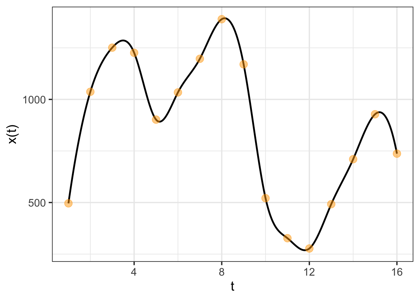 \[p_1(t) \equiv a_1 + b_1 \left[t - t_1\right] + c_1 \left[t - t_1\right]^2\] \[p_2(t) \equiv a_2 + b_2 \left[t - t_2\right] + c_2 \left[t - t_2\right]^2\] \[p_3(t) \equiv a_3 + b_3 \left[t - t_3\right] + c_3 \left[t - t_3\right]^2\] The four knots are \[\left[\begin{array}{c}\left(t_1, x_1\right)\\ \left(t_2, y_2\right)\\ \left(t_3, y_3\right)\\ \left(t_4, y_4\right)\\ \end{array}\right]\] which you can think of as two columns of a data frame, one with the \(t\)-coordinates of the knots and the other with the \(y\)-coordinates. For the knots in Figure fig-quadratic-spline the data table is