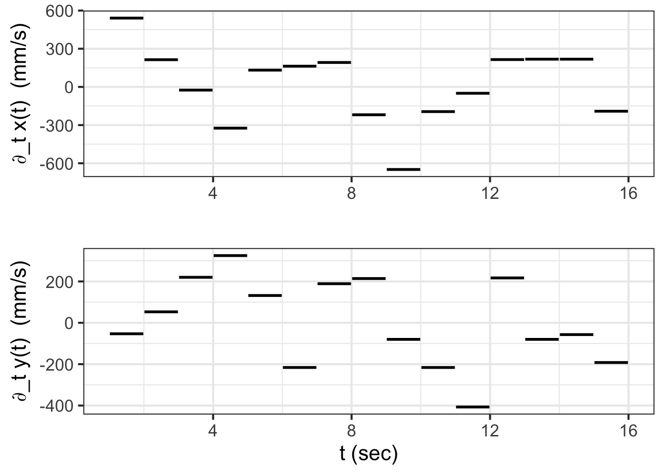 Since the original \(x(t)\) and \(y(t)\) functions are piecewise linear, it makes sense that the derivatives with respect to time are piecewise constant. But the robot hand is a physical thing; it has to have a velocity at every instant in time. It cannot instantaneously have an undefined velocity.