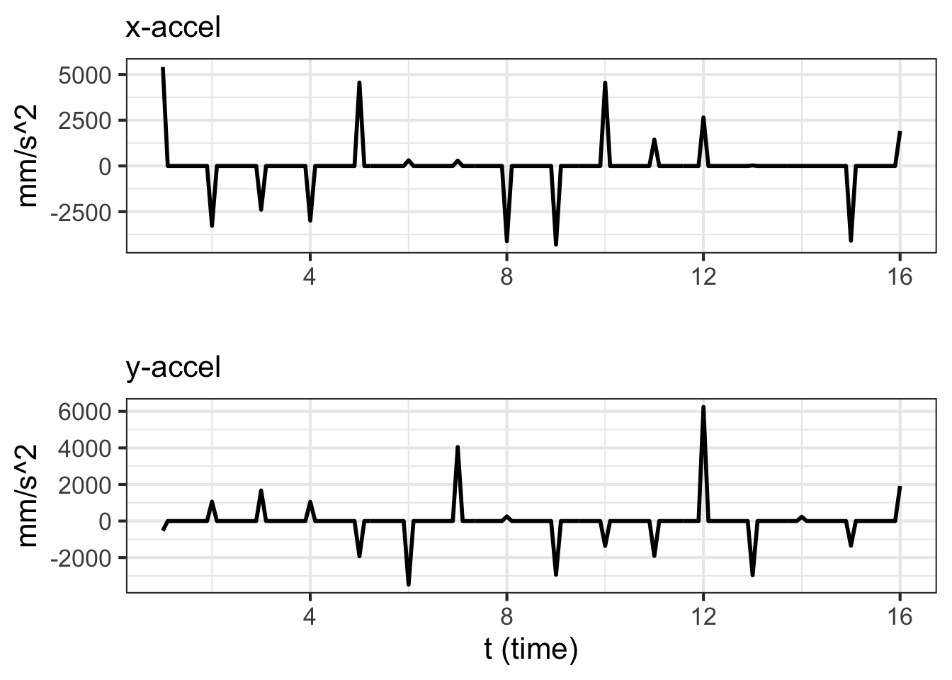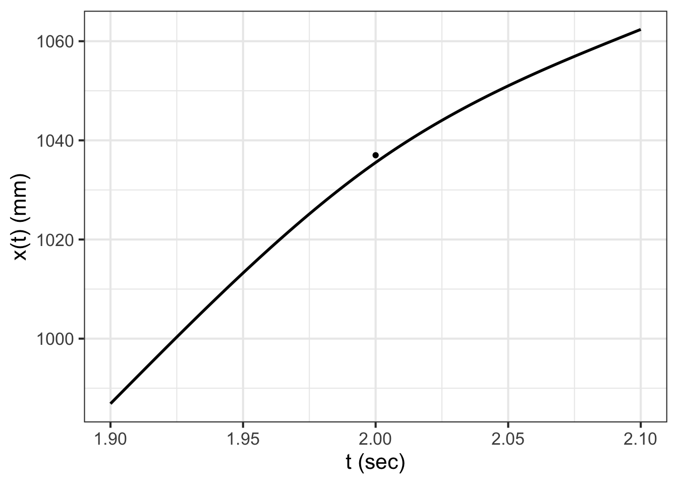Each functions in Figure fig-piecewise-linear-path is an interpolating function. You’re entitled to think of the \(x(t)\) function as connecting with lines the sequence of \(x\) versus \(t\) coordinates from the table and similarly for \(y(t)\). Each of the two functions is continuous. But, based on your work in Blocks 1 through 3, you have a richer set of concepts for interpreting those two functions.
