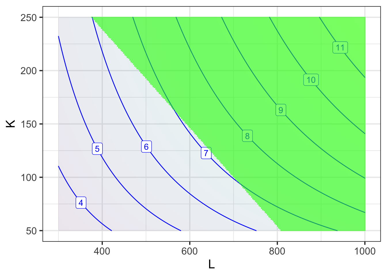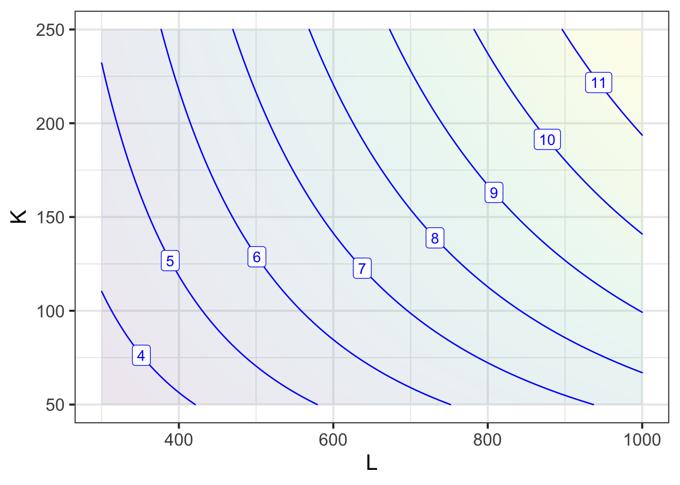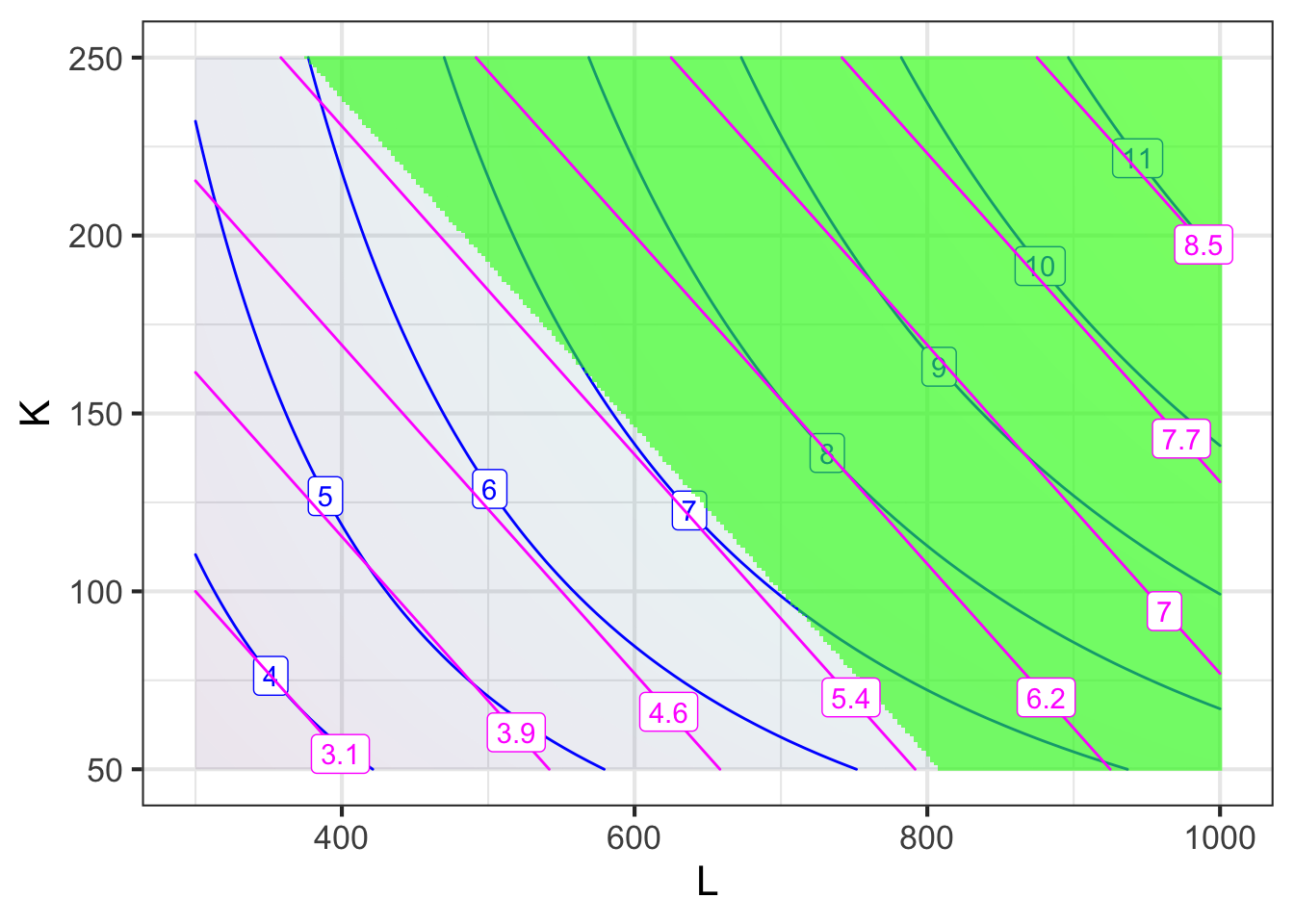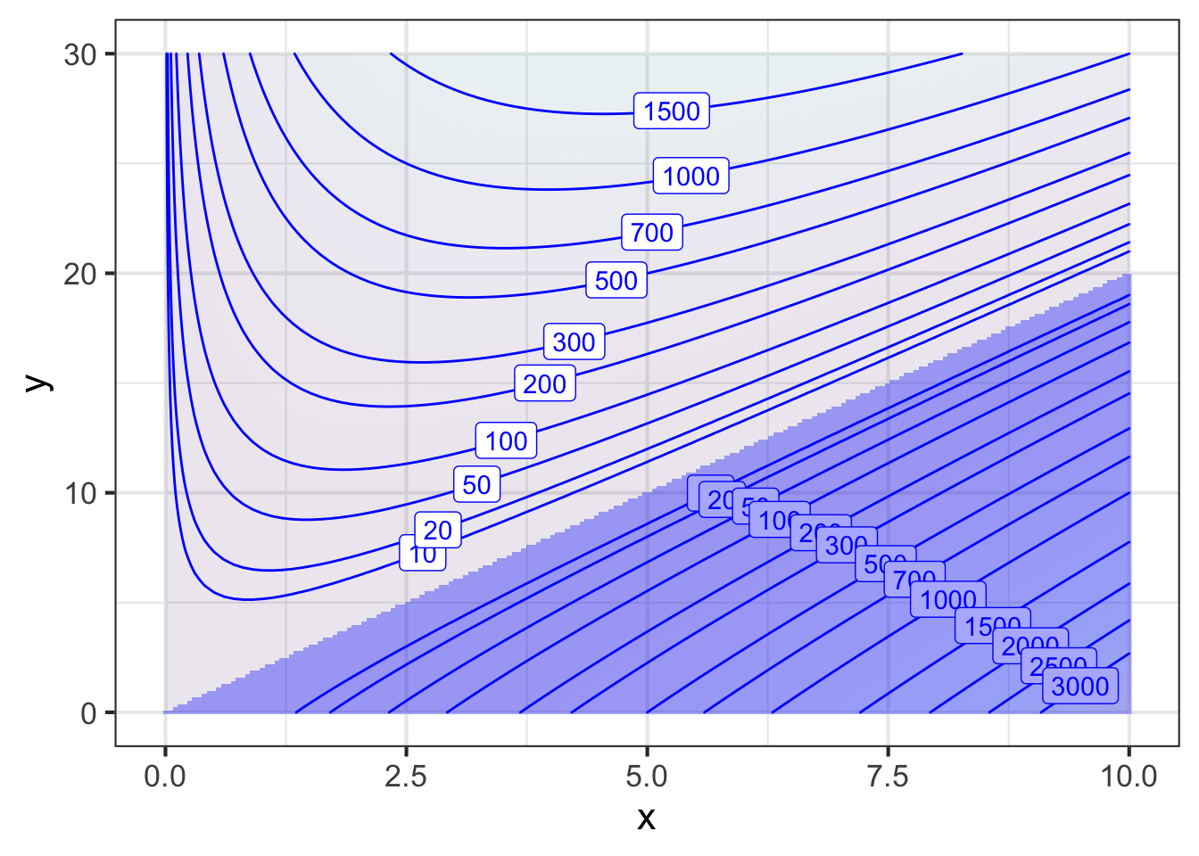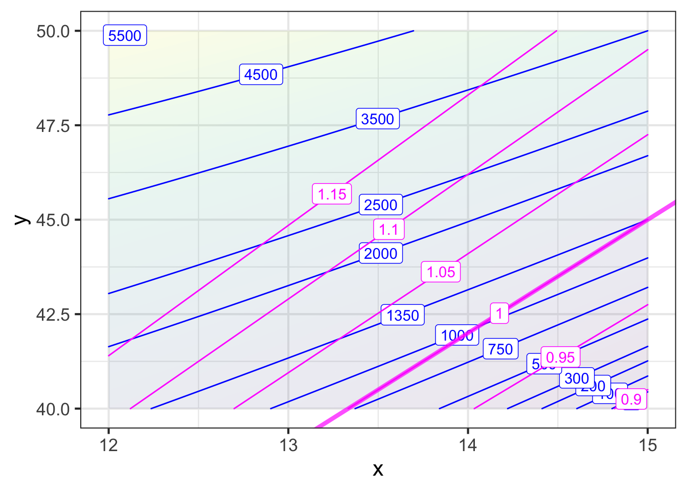 Generations of calculus students have been taught a method of mathematical optimization in the presence of constraints that involves positing a Lagrange multiplier, typically written as \(\lambda\), and carrying out a series of differentiations followed by equation solving to find an argmax, which simultaneously provides a numerical value for \(\lambda\). It is easier to understand the motivation behind this by considering the gradient of the objective function and the gradient of the constraint function. If the goal is, say, to maximize production and simultaneously minimize expenditures, we would want to walk up the production gradient and down the expenditure gradient.