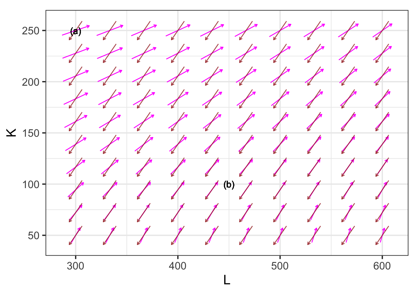 Figure fig-cobb-doug-grad shows two gradient fields, one for the production function in the factory-design example and one for expenditure. (The negative of the expenditure gradient is shown, since the goal is to keep expenditures small.)
