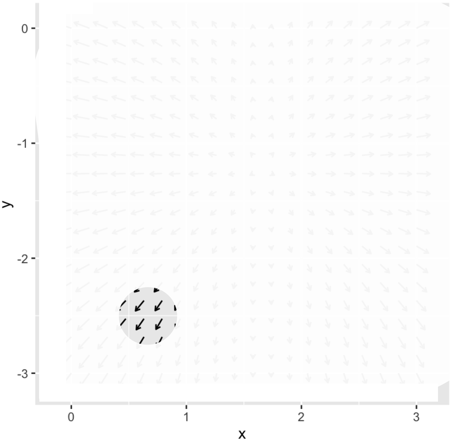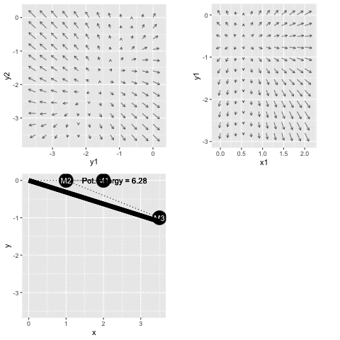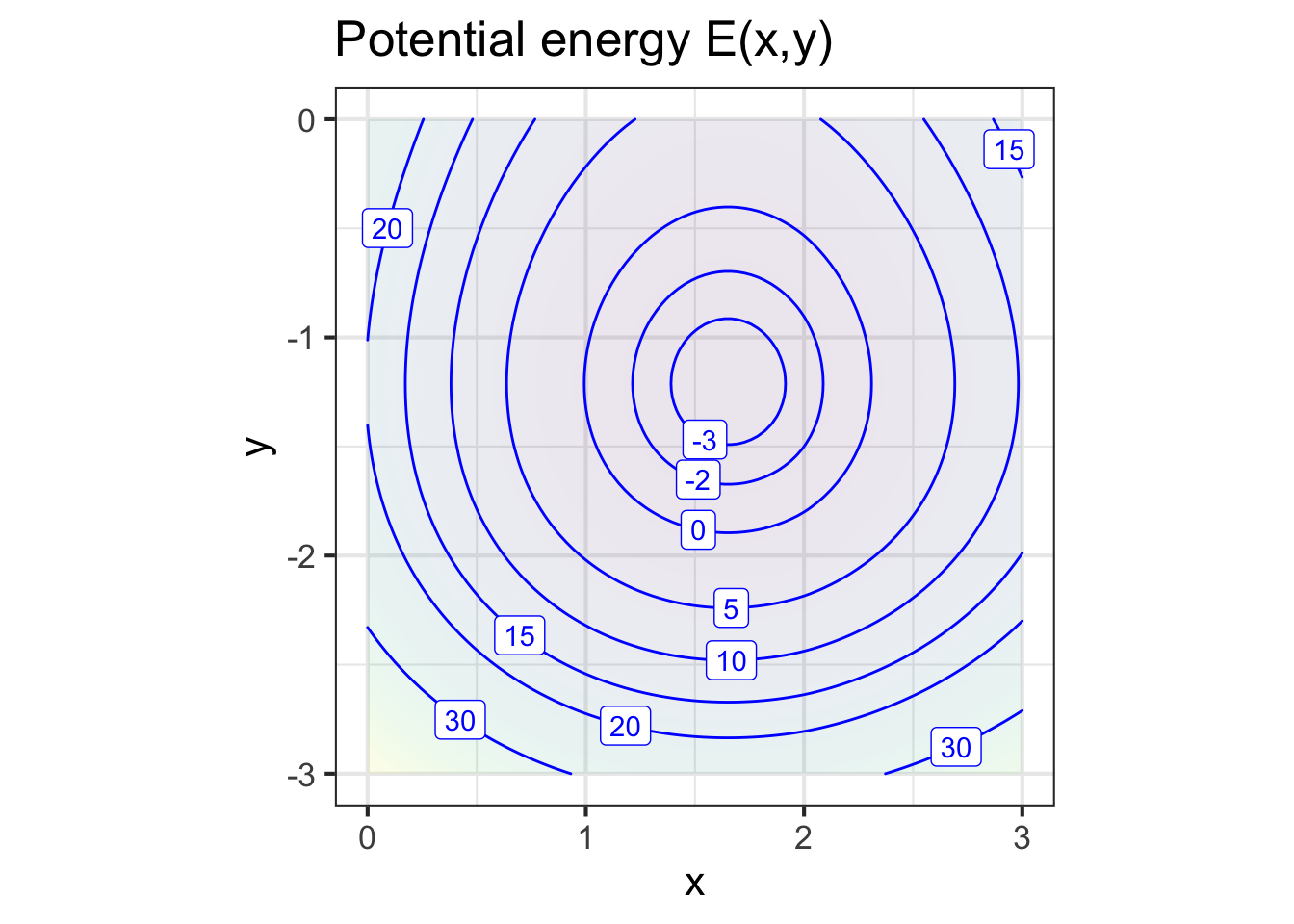 The potential energy function \(E(x,y)\) has a bowl-like shape. The bottom of the bowl—the argmin—is near \((x=1.7, y=-1.3)\). Referring to Figure fig-spring-mass1, the equilibrium position is a bit upward and to the right of the position shown in the figure.