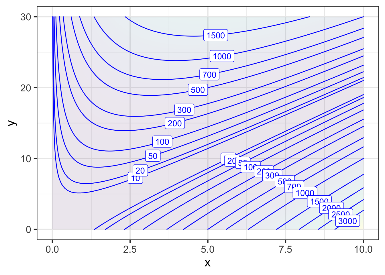 In the previous section, the box designer’s request that the box be cubic was translated into an equality constraint, \(y-3x=0\), shown as the green line in Figure fig-cube-total-cost. The skilled modeler can bring additional power to the analysis by translating that constraint, \(y-3x=0\) into a function, for example \[\text{Equation:}\ \ \ y - 3x = 0\ \ \longrightarrow\ \ \ \text{Function:}\ \ \text{cube-box}(x, y) = y / 3x\ .\] Any \((x^+, y^+)\) that produces \(\text{cube-box}(x^+, y^+) = 1\) is a pair that satisfies the constraint. In other words, the equality constraint amounts the 1-contour of the cube_box() function.