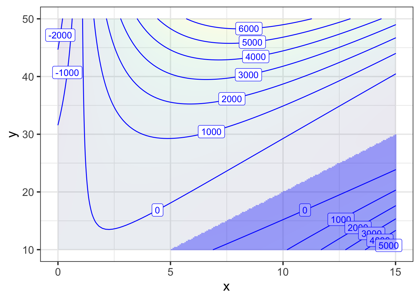 With the \((x,y)\)-domain restricted to the values that are physically realistic, we can see that the argmax is still on the edge of the frame, at \(y=30\) and \(x\approx 5\), where the volume of the box will be about 1800 in3. This result should cause you pause, since there was nothing in the problem statement that limited \(y\) to be 30” or less. If we replotted with a larger domain for \(y\), we should see still larger boxes, without any limit.