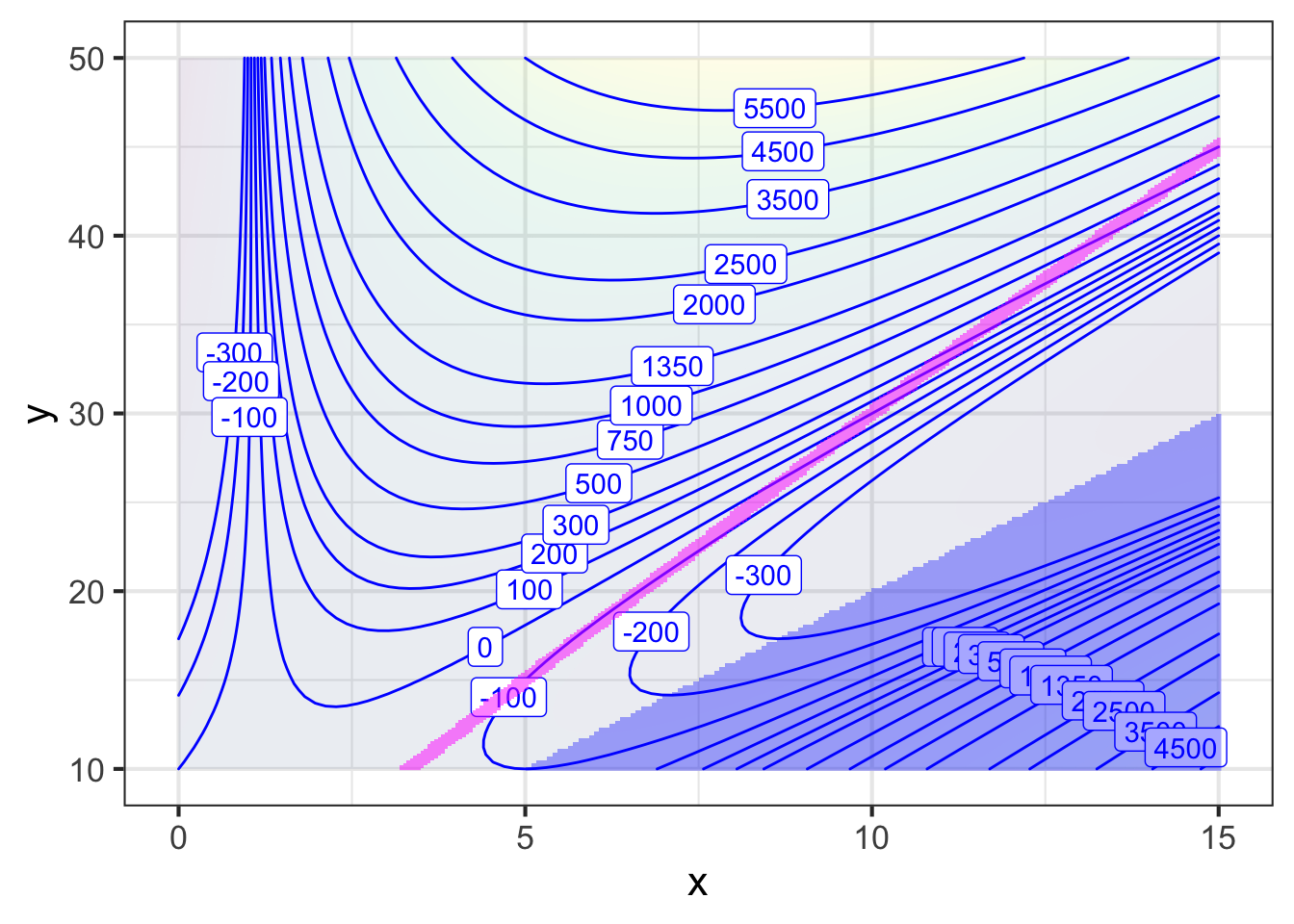 Earlier, we saw that if restricted to inputs on the contour \(\text{cube-box}(x,y) = 1\), the optimal output value of Profit() is about $13.50. Now we have a broader picture. For instance, suppose we allow a “little” deviation in box shape from a cube, say, cube_box(x,y) = 1.05. If we allowed this, the value of the Profit() function could be increased from $13.50 to about $22.50 .