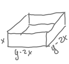 The area of the bottom of the box is \((y - 2x)^2\) and the box height is \(x\). The objective function is the volume of the box, area times height: \[V(x, y) \equiv x (y - 2x)^2\ .\] There are two inputs, \(x\) and \(y\), so a simple plot should suffice to find the argmax.