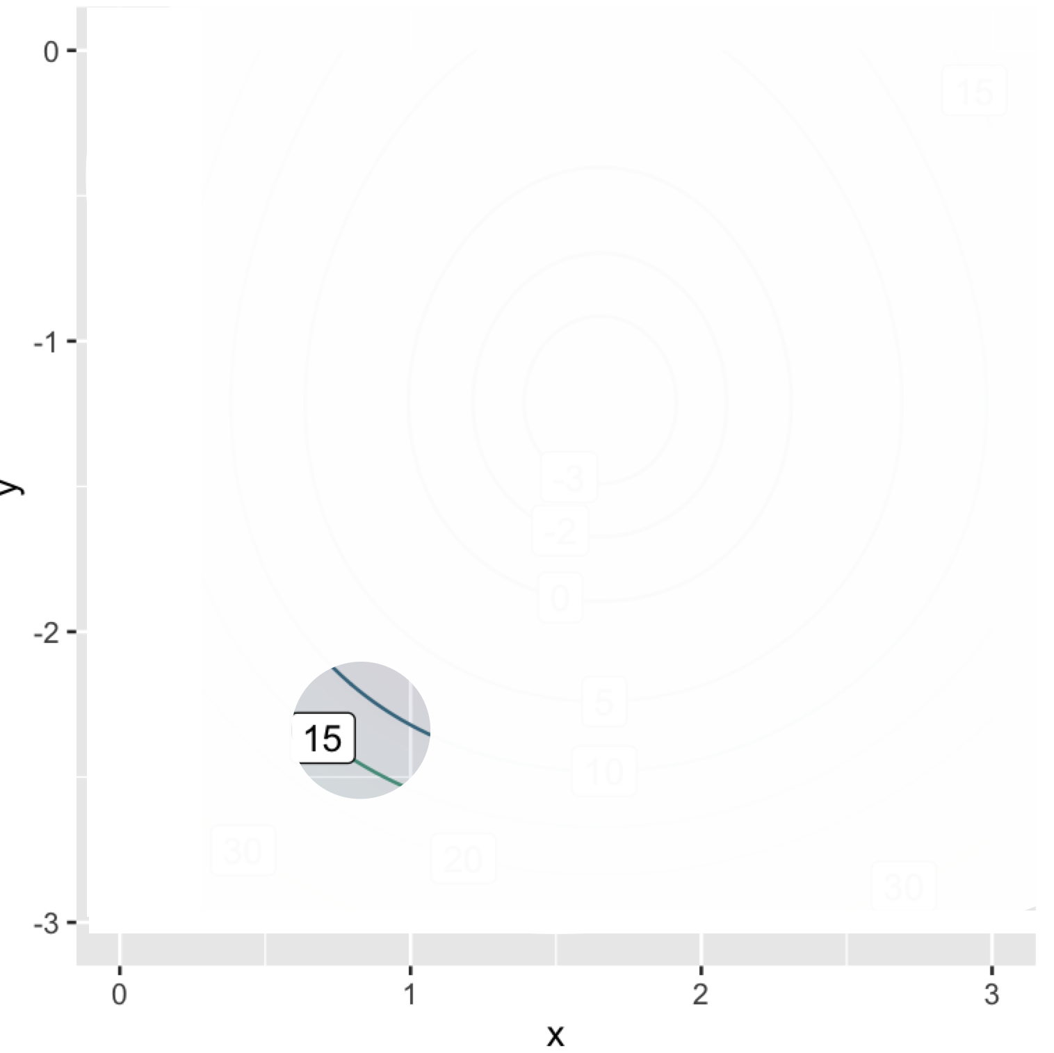 The mathematical equivalent to sensing which direction is uphill is to calculate the gradient of the objective function. sec-partial-change uses partial differentiation with respect to each of the input quantities to assemble the gradient vector, denoted \(\nabla f() = \left({\large \strut} \partial_x f(), \ \partial_y f()\right)\). In Figure fig-loophole, where we are standing at about \((x_i=0.8, y_i=-2.3)\), we would evaluate the each of the partial derivatives in the gradient vector at \((0.8, -2.3)\).