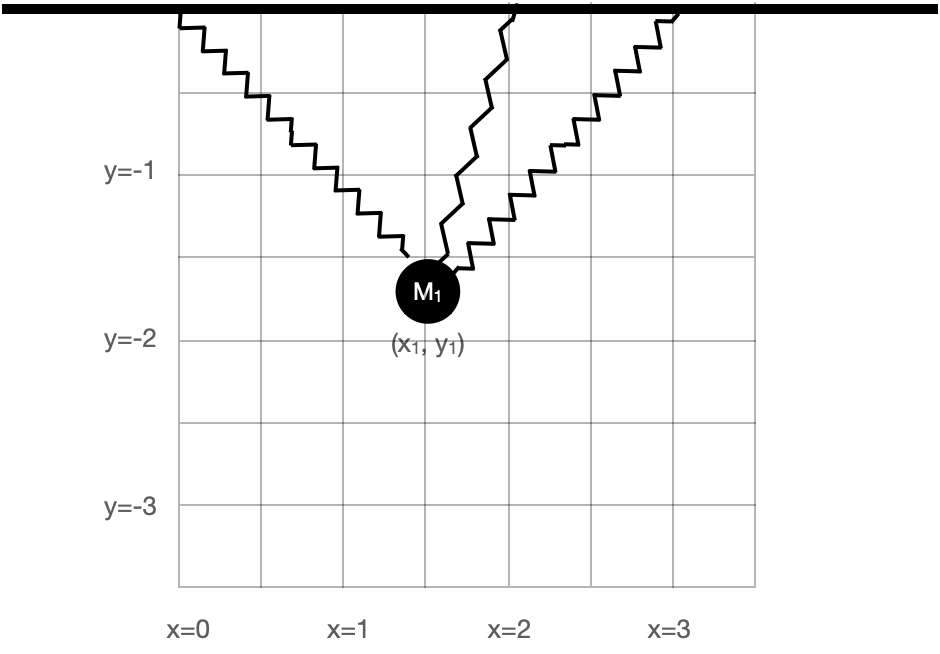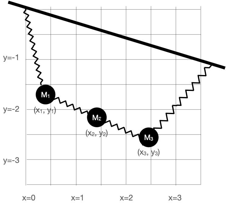 With a graph of the objective function like Figure fig-spring-mass1-pot, the solution phase is simple; a graph will do the job. But for more complicated objective functions, with more than 2 inputs, drawing a complete graph is not feasible. For example, in the spring-mass system shown in Figure fig-spring-mass-3, the potential energy function has six inputs: \(x_1, y_1, x_2, y_2, x_3, y_3\). In genuine applications of optimization, there are often many more inputs.