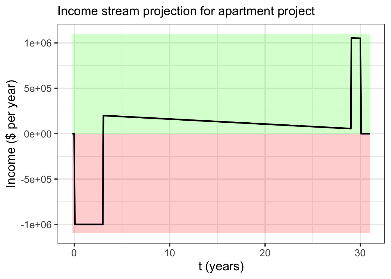 The net present value (NPV) of a nominal income stream \({\cal M}(t)\) is simply the sum of the stream discounted to the present value. Since we are imagining that the income stream is a function of continuous time, the sum amounts to an integral: \[\text{NPV} \int_\text{now}^\text{forever} {\cal M}(t)\ {\cal D}(t)\, dt\ .\]