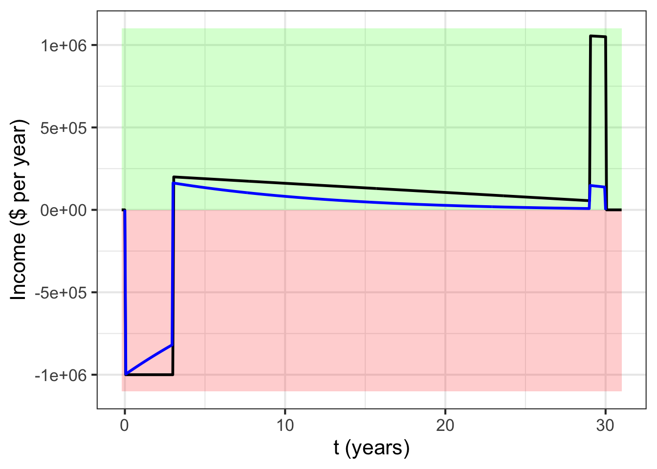 - Simply discount the original NPV to account for it becoming available \(T\) years in the future, that is, \[\text{NPV}_\text{delayed} = {\cal D}(T)\ \text{NPV}_\text{original} = \int_0^\infty {\cal M}(t)\ {\cal D}(T)\ {\cal D}(t)\, dt\ \]