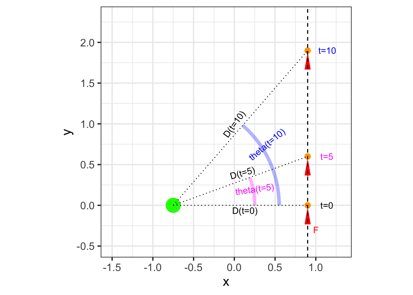 \[\partial_t y(t) = \frac{\overbrace{\ F}^\text{force}}{\underbrace{M}_\text{mass}} t \ \ \text{and}\ \ \partial_t \theta(t) = \frac{\overbrace{F\, D_0}^\text{torque}}{\underbrace{m D(t)^2}_\text{moment of inertia}}\ t\ .\] In rectangular \((x,y)\) coordinates, the velocity is the accumulation of force divided by mass: the usual statement of Newton’s second law of motion. In the angular coordinates \((\theta, D)\) the angular velocity is the accumulation of torque divided by ***moment of inertia.