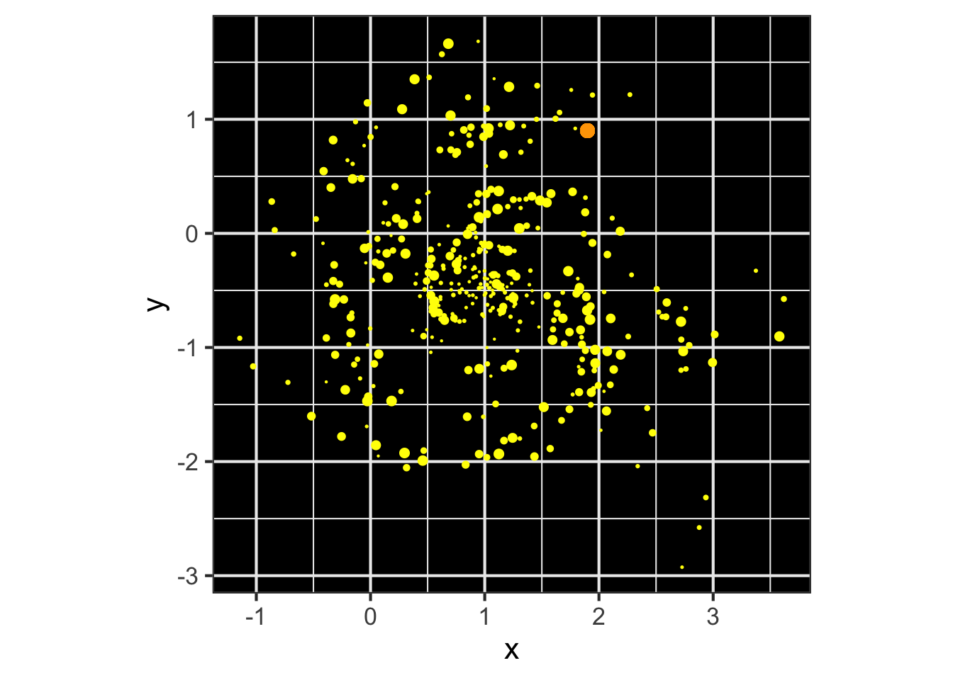 In considering a physical object of extended shape, it can be a great simplification to be able to treat the whole extended object as if it were a simple point object at a single location. For instance, Figure fig-galaxy-probe imagines a space probe (orange dot) coasting through the edge of a galaxy.