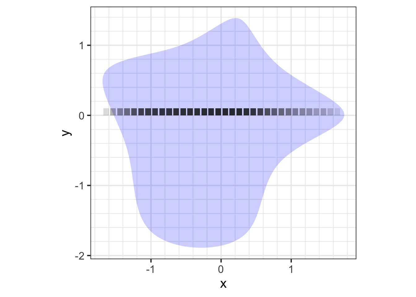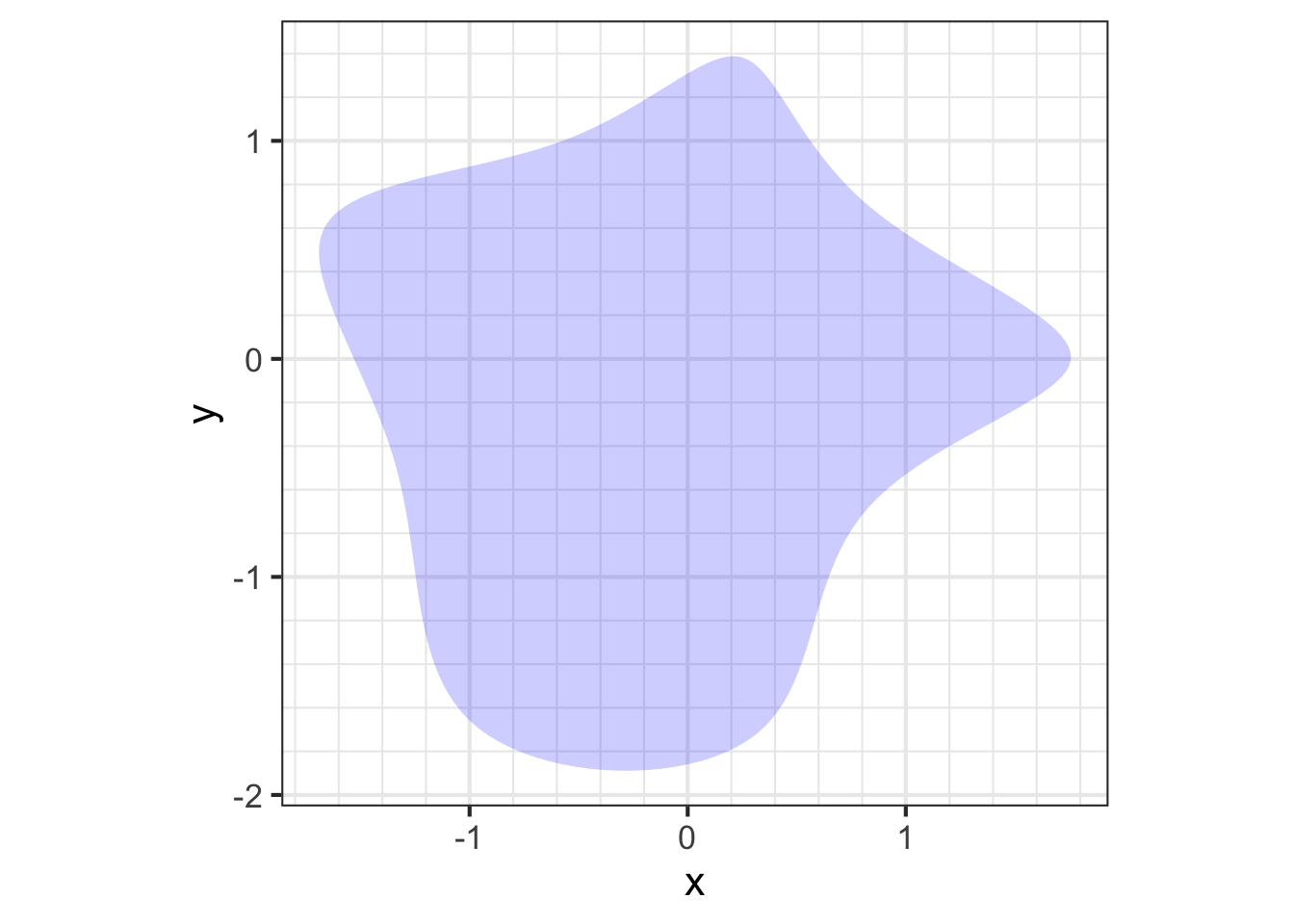 For a continuous shape, such as in Figure fig-shape1 (left) we can describe the center-of-mass calculation as an accumulation of the mass-density function \(\rho(x, y)\) over the entire shape \(S\). The mass of the object is the accumulation of mass-density itself \[M = \int_\text{S} \rho(x,y)\ d\text{S}\] while the components of the center of mass are the accumulation of \(x\ \rho(x,y)\) and \(y\ \rho(x,y)\), that is: \[ \bar{x} = \int_\text{S} x\ \rho(x,y)\ d\text{S} / M\\ \bar{y} = \int_\text{S} y\ \rho(x,y)\ d\text{S} / M \] where \(S\) refers to the whole object and \(d\)S is a differential of the object, that is, a tiny piece of the object.