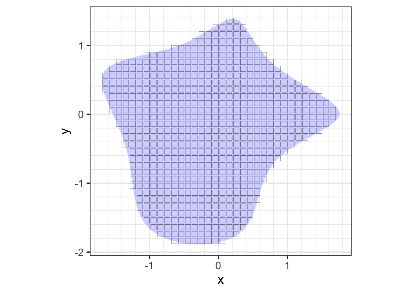 There are many ways to split an object up into differentials so that they can be accumulated to give the whole integral. One simple way, shown in Figure fig-shape1 (right), is to divide the object into a set of discrete, non-overlapping, adjacent rectangles (or cubes for a three-dimensional object). Then, as with adding up the stars, just add up \(x \rho(x, y) d\)S or \(y \rho(x,y) d\)S contained in each of the rectangular \(d\)A regions. For the rectangle located at $(x_i, y_i), the mass \(m_i\) will be \(m_i = \rho(x_i, y_i) d\)S: density times area of each rectangle. This turns the integrals in Eq. @ref(eq:cm-integral) into a sum: