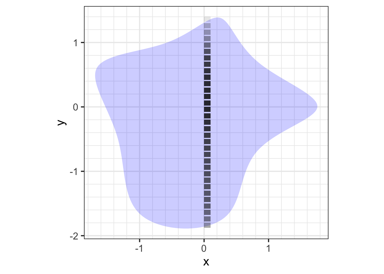 Finding the \(y\)-component of the center of mass could be done in a similar way, by constructing horizontal slices. However, we would have to calculate the functions \(\text{left}(y)\) and \(\text{right}(y)\) that bound each slice.